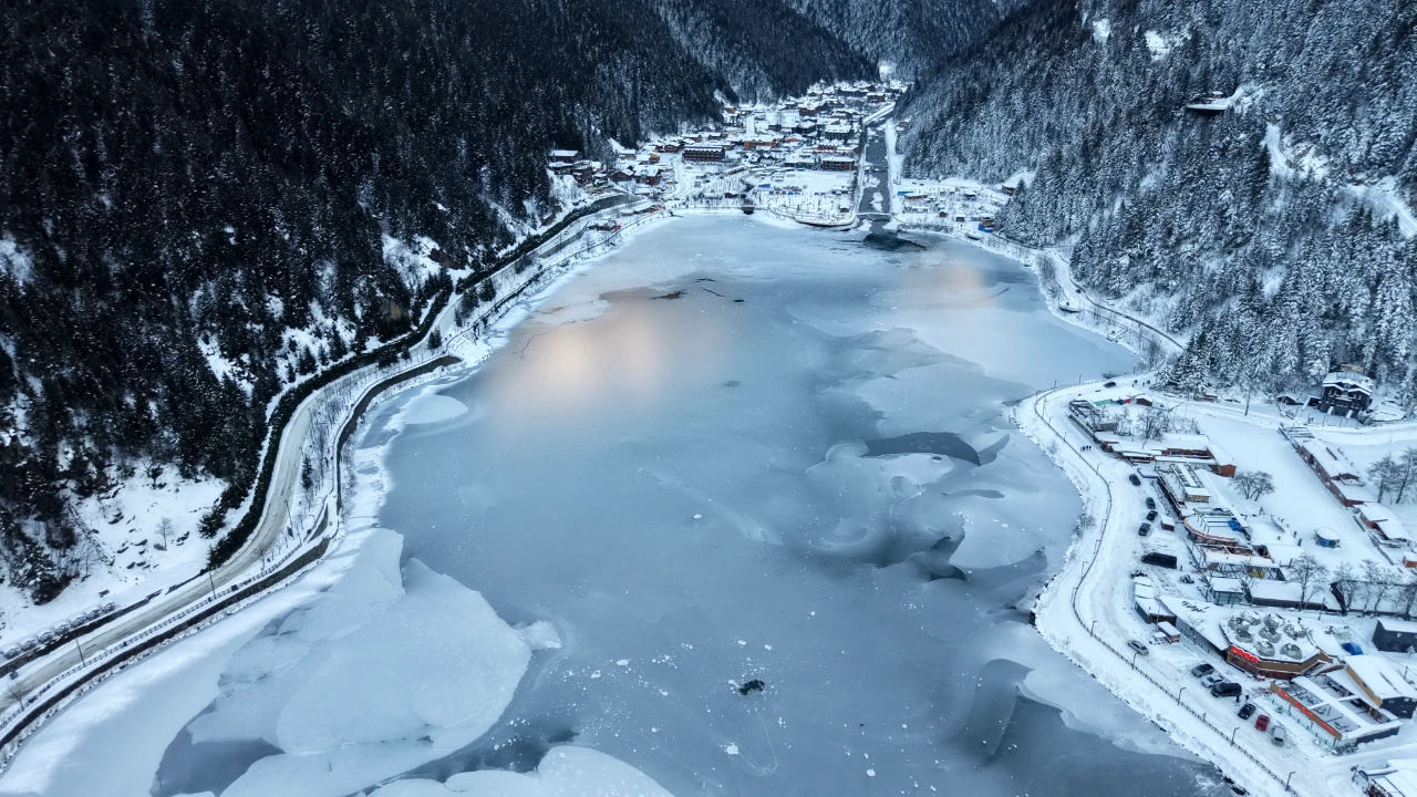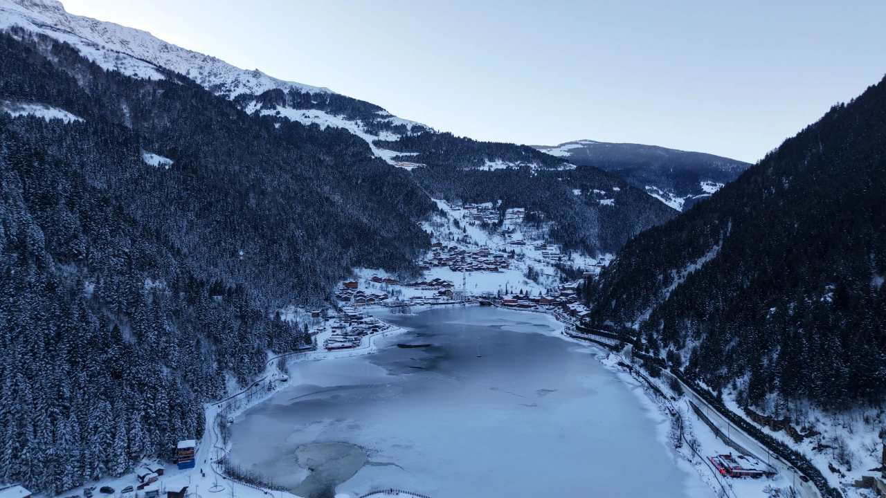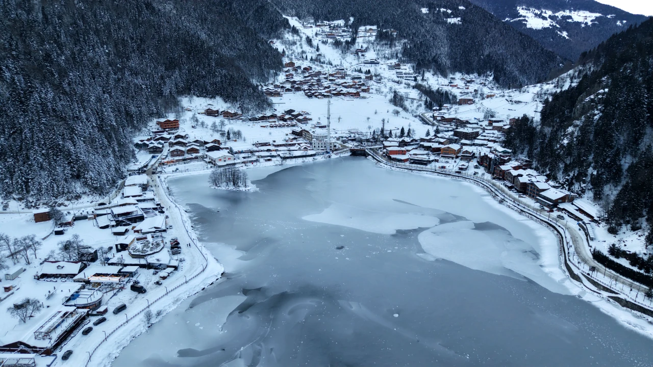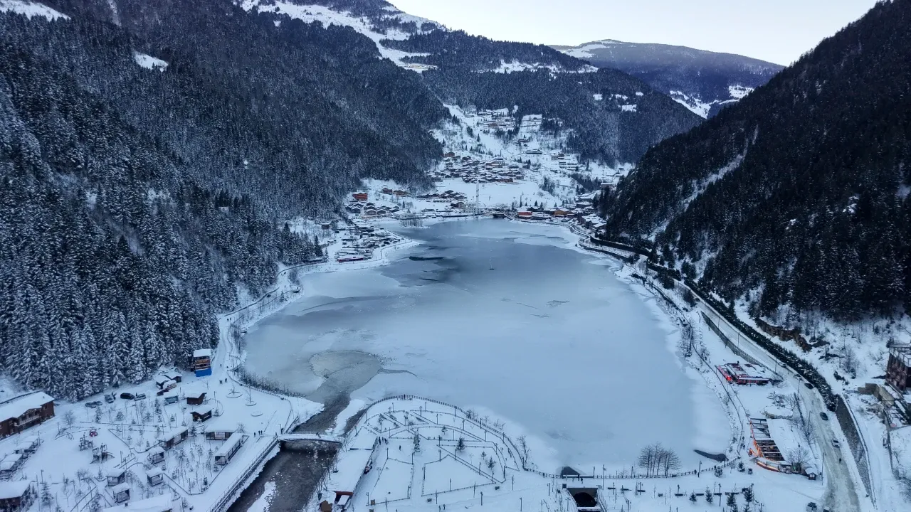 Uzungöl'ün kuşbakışı görünümü, karla kaplı çatılar ve donmuş göl yüzeyiyle masalsı bir manzara sunuyor.