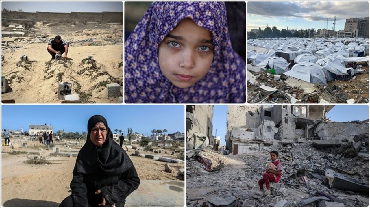 Harabeye dönmüş kent sokakları defalarca zorla yerinden edilen Filistinliler için sığınacak bir yer haline gelmişken, sokak köşelerinde biriken yığınlar arasında açlıktan bitkin düşmüş yüzlerde bayram neşesinden eser yok.