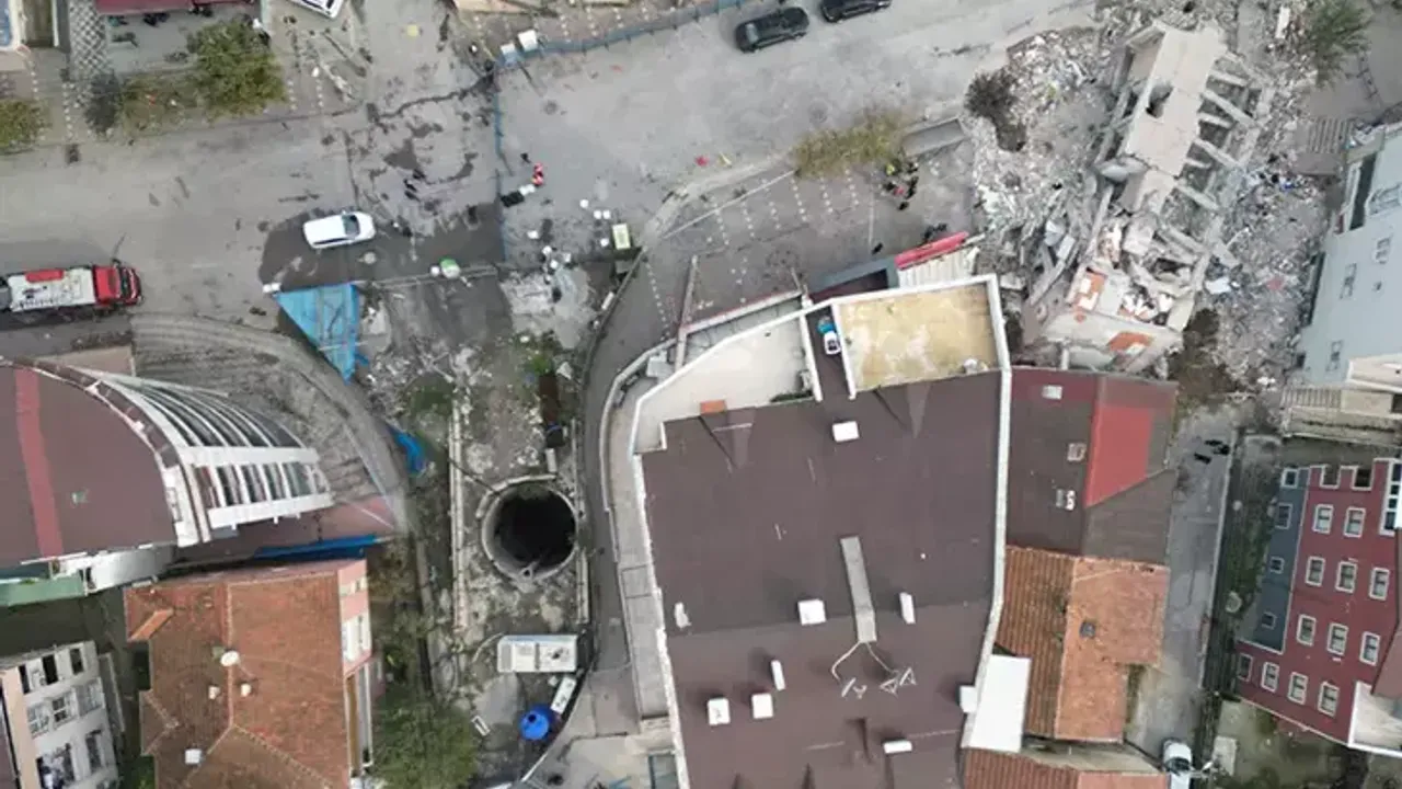 Yıkımın yaşandığı Arslan Apartmanı’nın enkazı ve mühürlenen 12 binanın bulunduğu bölge, dronla görüntülendi. Bölgede bir süredir devam eden metro hattı çalışmasının olduğu görüldü. Metro çalışması nedeniyle açılan kuyu da dron görüntülerine yansıdı.