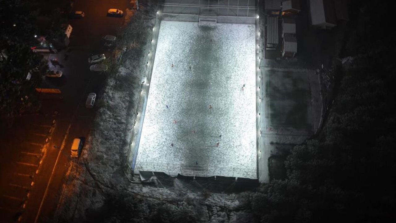 Soğuk havaya ve kar yağışına rağmen Maltepe’de halı saha maçı yapan bir grup futbolsever, karşılaşmalarını yarıda bırakmadı. Zemin şartlarının zorlaşmasına rağmen maçlarına devam eden oyuncular, halı sahada adeta beyaz örtü üzerinde mücadele etti.