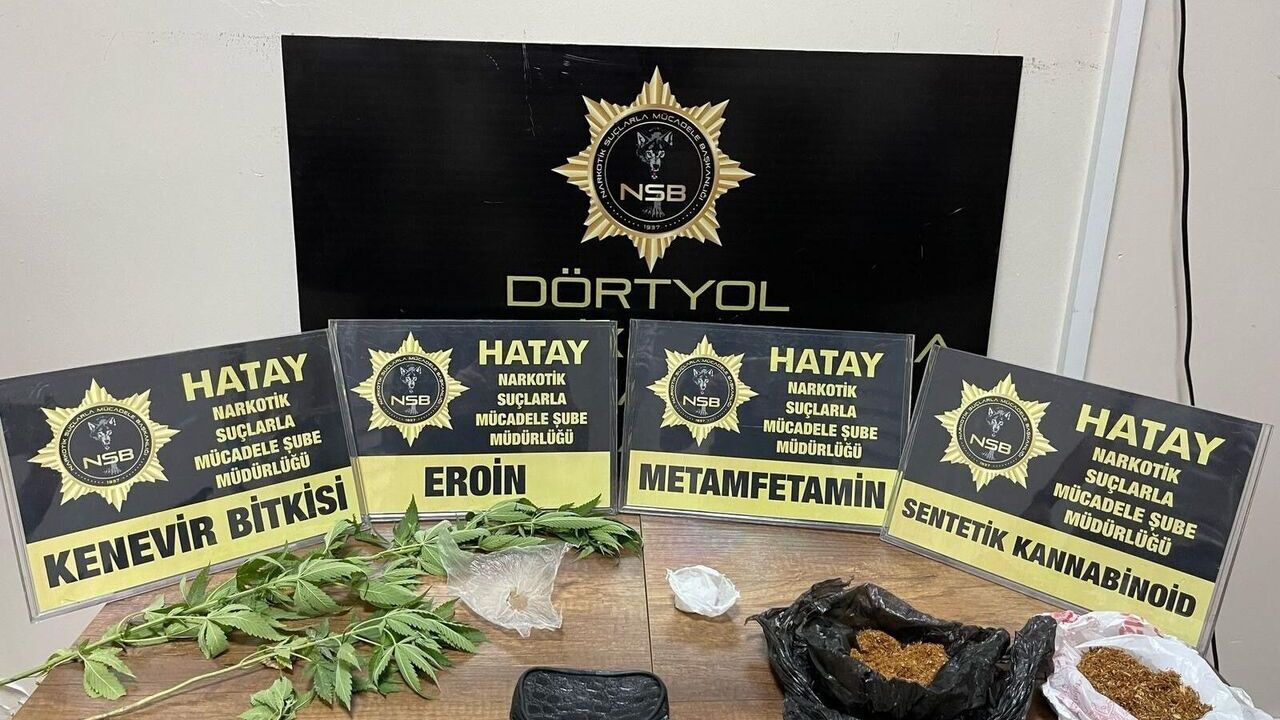 Dörtyol Numune Evler Mahallesi'nde belirlenen adrese yapılan baskında, 7,13 gram metamfetamin, 2 parça halinde toplam 58,56 gram sentetik kannabinoid, 1,70 gram eroin ve boyları 20 ile 75 santimetre arasında değişen 3 kök kenevir bulundu.