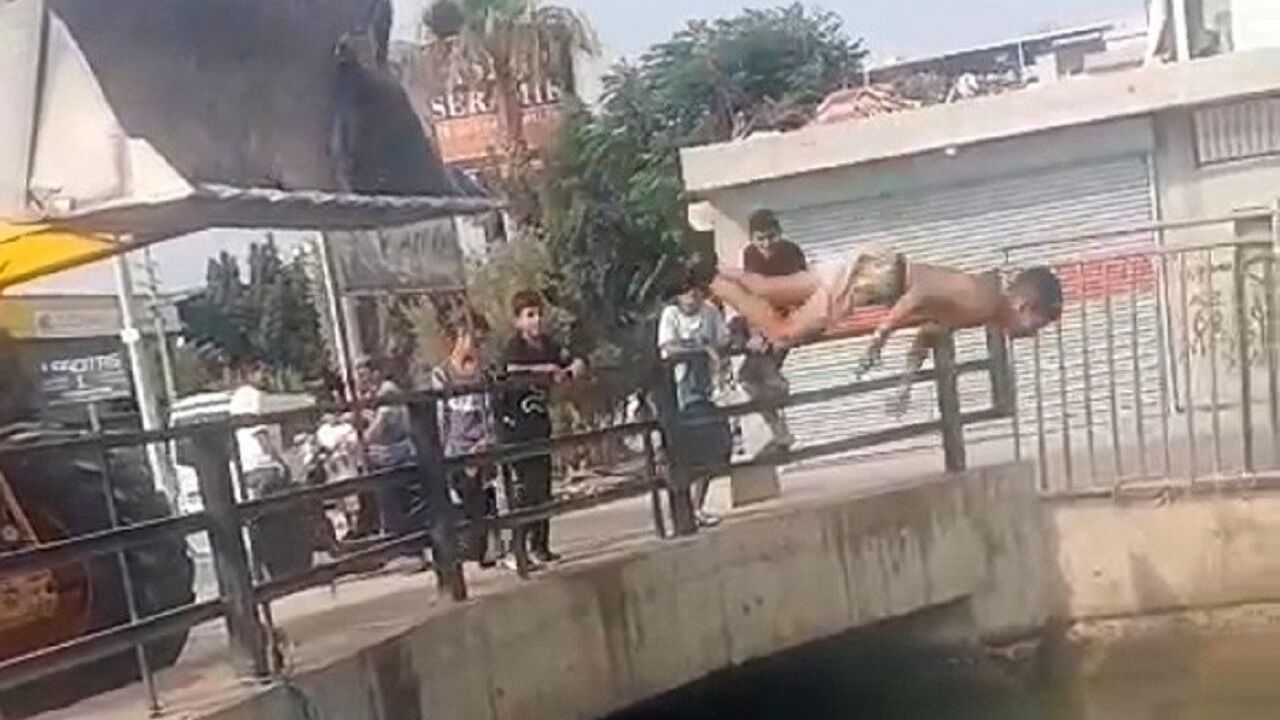 Adana’da nemle birlikte hissedilen bunaltıcı sıcaklardan korunmak isteyen çocuklar, sulama kanalının kenarında bulunan iş makinesini tramplen gibi kullanmaya başladı. İş makinesinin üzerine çıkan çocuklar, tehlikeye aldırmadan sulama kanalına atlayarak yüzmeye devam etti. Bu tehlikeli görüntüler çevredeki vatandaşların da dikkatini çekti.