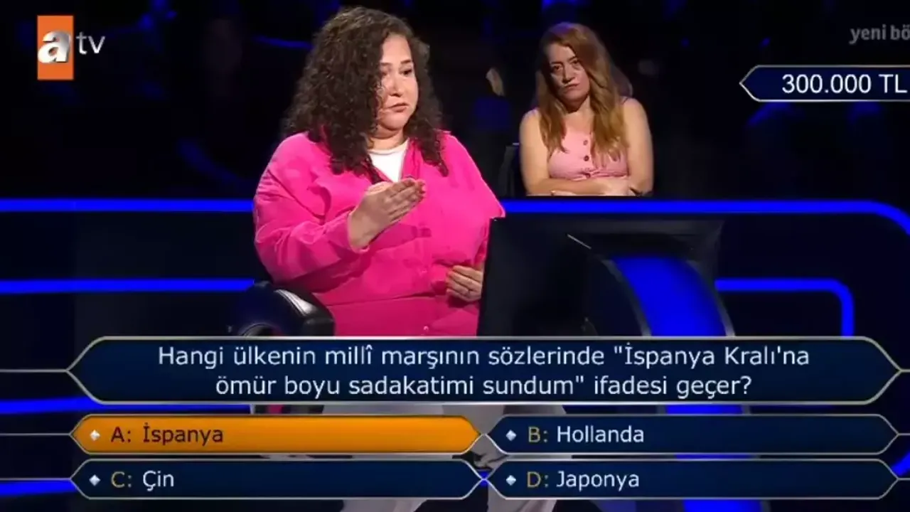 Türkiye'nin en çok izlenen bilgi yarışmalarından Kim Milyoner Olmak İster? programında, yarışmacılar tarih ve kültür sorularıyla ter dökmeye devam ediyor. Son yayınlanan bölümde, "Hangi ülkenin milli marşında 'İspanya Kralı'na ömür boyu sadakatimi sundum' ifadesi geçer?" sorusu izleyicilerin dikkatini çekti.