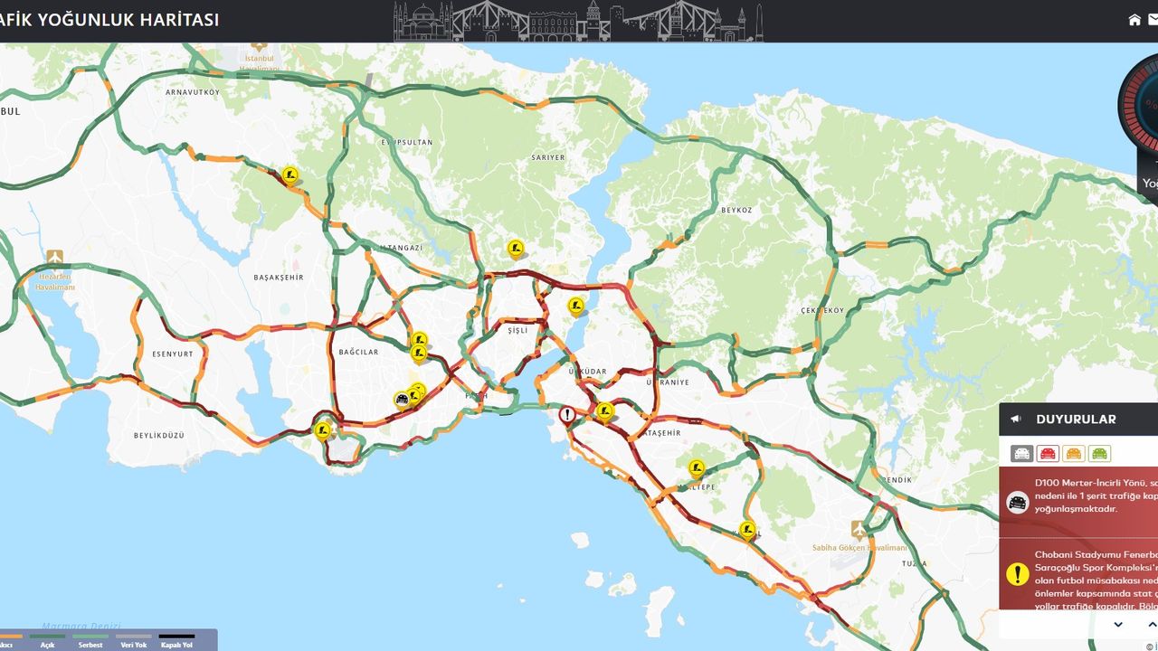 İstanbul Büyükşehir Belediyesi Trafik Yoğunluğu Haritası verilerine göre, saat 18.00 itibariyle kent genelinde trafik yoğunluğu kritik seviyelere ulaştı. Ana arterlerde ilerlemek neredeyse imkânsız hale gelirken, D-100 Karayolu Kozyatağı Mevkii’nde araçlar Şükrü Saracoğlu Spor Kompleksi yönünde güçlükle ilerleyebildi.