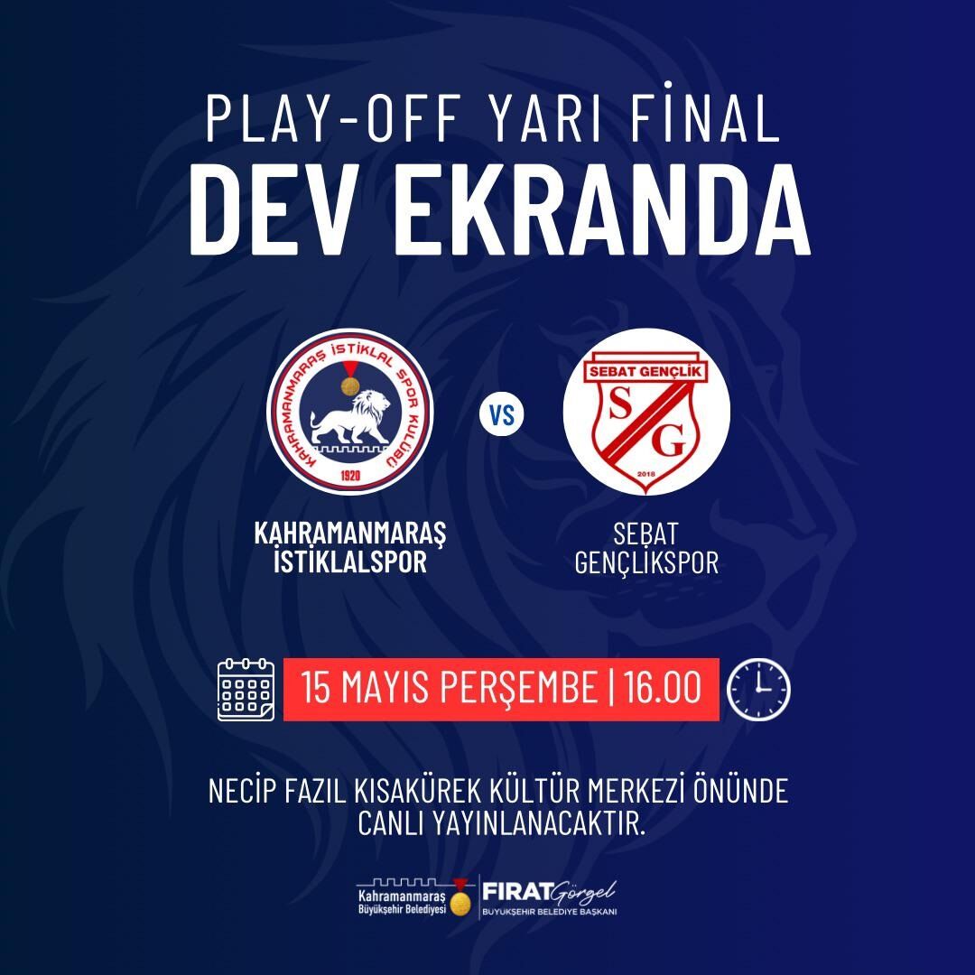 Büyükşehir Belediyesi tarafından organize edilen bu etkinlik, İstiklalspor’a olan desteği artırmayı hedefliyor. Takımın kritik yarı final maçında şehrin dört bir yanındaki sporseverler, dev ekran önünde bir araya gelerek takım ruhunu en üst seviyeye çıkaracak. Belediye yetkilileri, tüm Kahramanmaraşlıları dev ekran karşısında buluşup takımlarına destek vermeye davet etti.