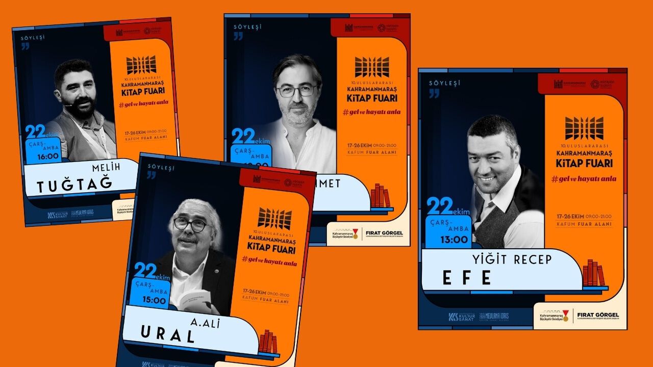 Kahramanmaraş Büyükşehir Belediyesi tarafından düzenlenen 10. Uluslararası Kitap Fuarı, edebiyat dünyasının sevilen isimlerini KAFUM’da ağırlamaya devam ediyor. Kitaplarla kurulan bağı daha da güçlendiren fuar, altıncı gününde de ziyaretçilerine dopdolu bir program sunacak. 22 Ekim Çarşamba günü birbirinden değerli dört yazar ve düşünce insanı, farklı yaş gruplarına hitap eden söyleşilerle edebiyat tutkunlarıyla buluşacak.