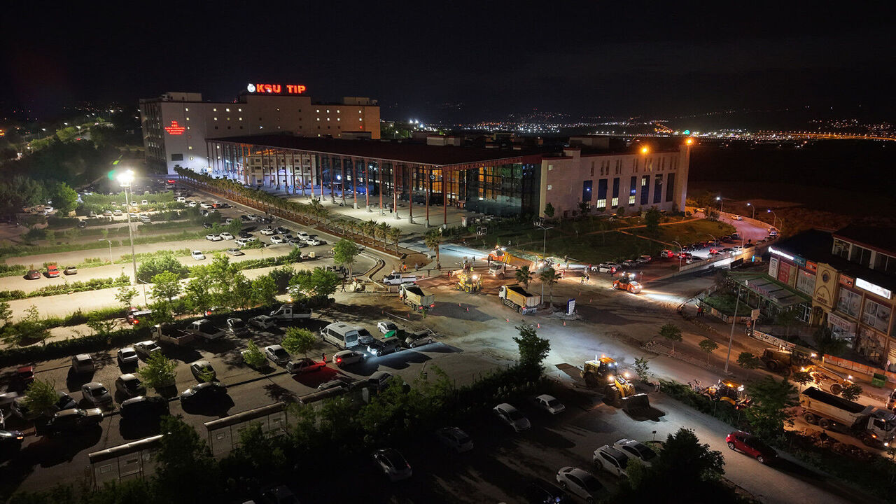 Kahramanmaraş Sütçü İmam Üniversitesi Sağlık Uygulama ve Araştırma Hastanesi’ne ulaşımı sağlayan ana arterde başlatılan asfalt çalışmaları, gece gündüz sürdürülen yoğun mesaiyle hızla ilerliyor. Deforme olmuş kilit parke taşlarının yerine sıcak asfalt dökülürken, proje kapsamında yürüyüş yolları, refüjler ve otopark alanları da baştan sona yenileniyor.