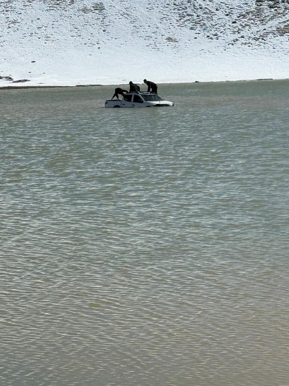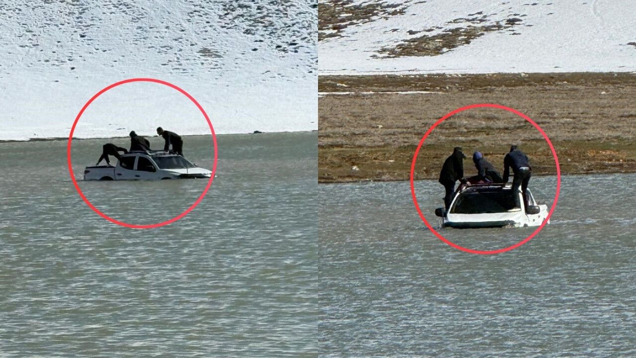 Bir süre sonra araçlarıyla gölün içine giren grup, su seviyesinin yükselmesi ve aracın motorunun su alması nedeniyle zor anlar yaşadı. Araç su içinde stop edince araç gölün ortasında kaldı.