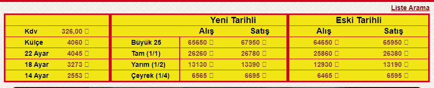 Tablodaki fiyatlar, yerel kuyumcuların alış ve satış oranlarıdır. Örneğin, büyük 25’lik altın alış 64.796,24 TL, satış 65.848,51 TL seviyesindedir. Yeni ve eski tarihli çeyrek altın arasındaki fark da yaklaşık 56 TL oldu; yeni tarihli çeyrek 6.598 TL’den alınırken 6.654 TL’ye, eski tarihli çeyrek 6.537 TL’den alım, 6.613 TL’ye satış gördü. Yarım altın 13.196 TL/13.307 TL, tam altın ise 26.310 TL/26.492 TL aralığında işlem görmektedir.