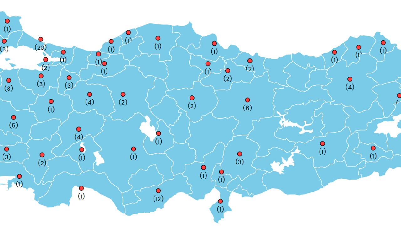 Kırklareli, Tekirdağ, İstanbul, Kocaeli, Yalova, Bursa, Balıkesir, Çanakkale, İzmir, Manisa, Aydın, Eskişehir, Bilecik, Bolu, Düzce, Zonguldak, Bartın, Kastamonu, Ankara, Kütahya, Afyon, Denizli, Muğla, Isparta, Antalya, Konya, Aksaray, Mersin, Adana, Osmaniye, Hatay, Yozgat, Amasya, Samsun, Kahramanmaraş, Ordu, Tokat, Rize, Artvin, Ardahan, Erzurum, Ağrı, Hakkari, Diyarbakır, Siirt, Van, Sivas