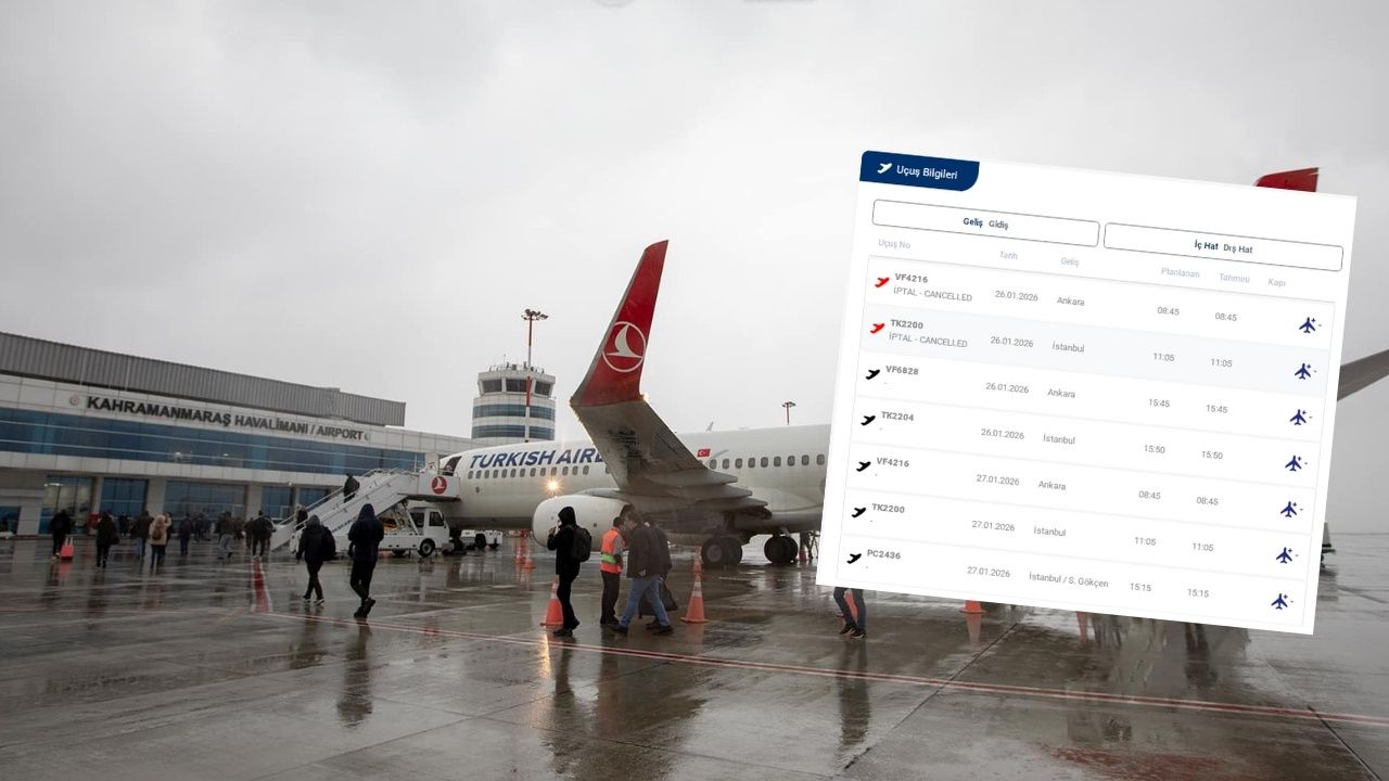 Sabah saatlerinde Kahramanmaraş’tan Ankara’ya yapılması planlanan Pegasus’un VF4216 sefer sayılı uçuşu ile THY’nin İstanbul’a gerçekleştireceği TK2200 seferi, aynı planlanan saatlerde iptal edildi. Hava muhalefetinin neden olduğu bildirilen iptaller, yolcuların mağduriyetine yol açtı. Uçuşların yeniden ne zaman başlayacağıyla ilgili havayolu firmalarından henüz net bir açıklama yapılmadı.