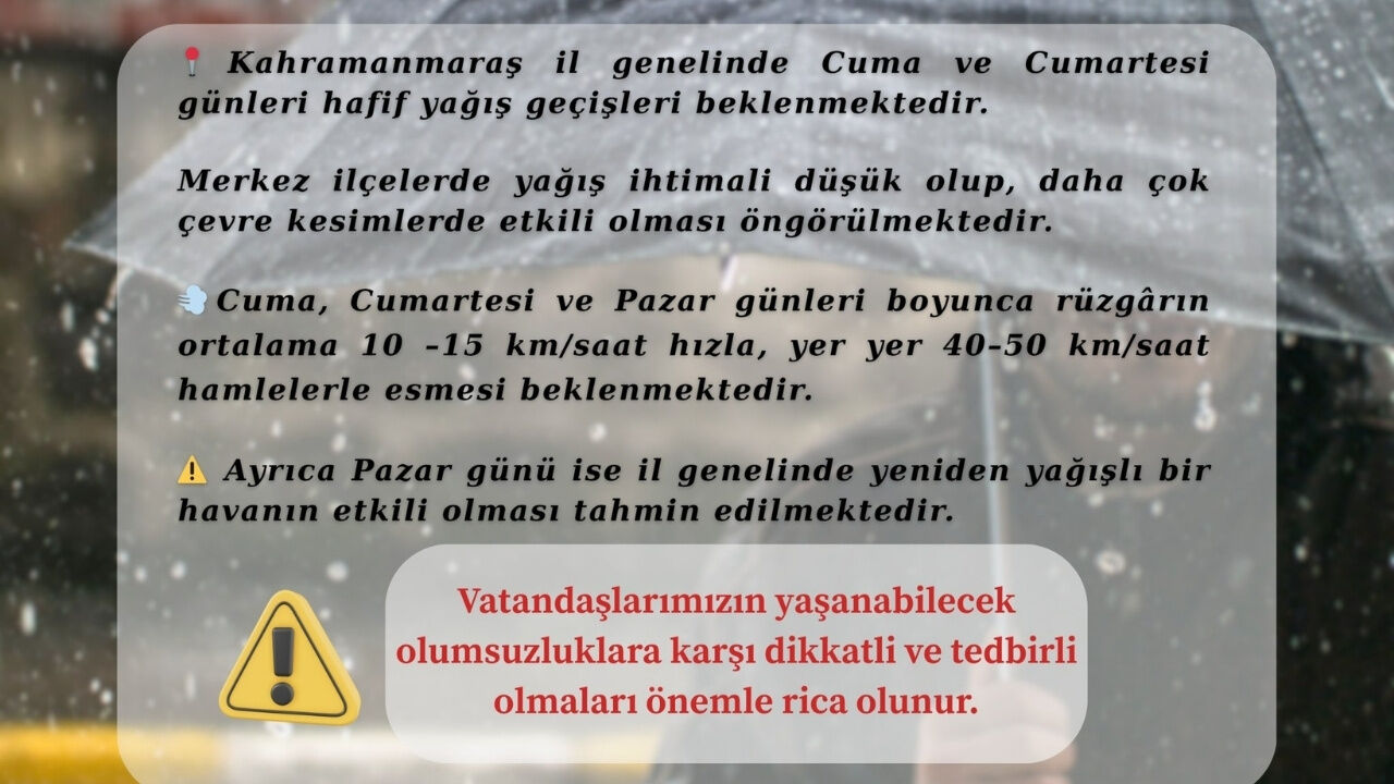 Valilikten yapılan açıklamada, Kahramanmaraş il genelinde Cuma (yarın) ve Cumartesi günleri hafif şiddette yağış geçişlerinin beklendiği ifade edildi. Merkez ilçelerde yağış ihtimalinin çevre kesimlere oranla daha düşük seyredeceği belirtilirken, yağışların daha çok kentin yüksek ve çevre kesimlerinde etkili olması öngörülüyor. Şehir merkezinde açık havada faaliyet gösterecek vatandaşların ve ulaşım sağlayacak sürücülerin yer yer ıslanan zeminlere karşı dikkatli olması önerildi.