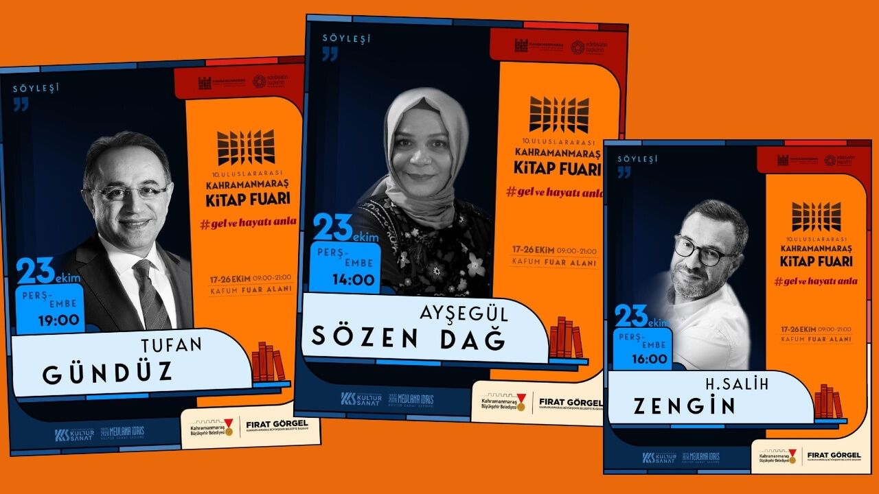 Kahramanmaraş Büyükşehir Belediyesi tarafından bu yıl 10’uncusu düzenlenen Uluslararası Kahramanmaraş Kitap Fuarı, her gün dolu dolu etkinliklerle devam ediyor. Fuarın yedinci günü olan 23 Ekim Perşembe, edebiyat ve tarih alanlarında önemli isimleri ağırlayacak. Ayşegül Sözen Dağ, Salih Zengin ve Prof. Dr. Tufan Gündüz, farklı saatlerde gerçekleşecek söyleşilerle kitapseverlerle buluşacak. Büyükşehir Belediyesi, tüm vatandaşları bu özel kültür gününe davet ediyor.