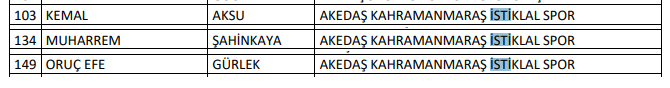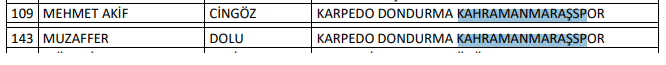 Sevk listesinde, Kahramanmaraş’ı temsil eden iki profesyonel kulüp olan AKEDAŞ Kahramanmaraş İstiklalspor ve Karpedo Dondurma Kahramanmaraşspor forması giyen futbolcular da yer aldı.