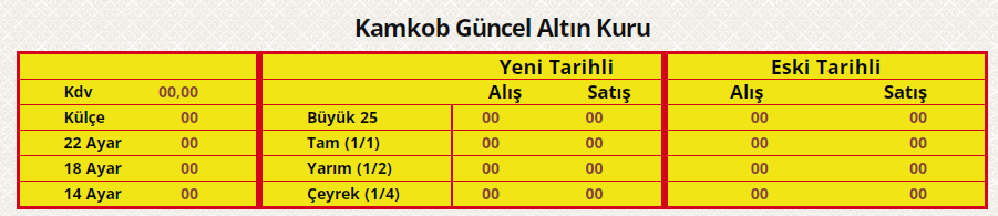 Normal şartlarda Kamkob’un resmi internet sitesinde külçe, 22 ayar, 18 ayar, 14 ayar altın fiyatlarının yanı sıra çeyrek, yarım, tam ve büyük altınların alış-satış fiyatları günlük olarak yayınlanıyor. Ancak bugün tabloya giren kullanıcılar, KDV satırından çeyrek altın satışına kadar tüm satırlarda “00 TL” ifadeleriyle karşılaştı.