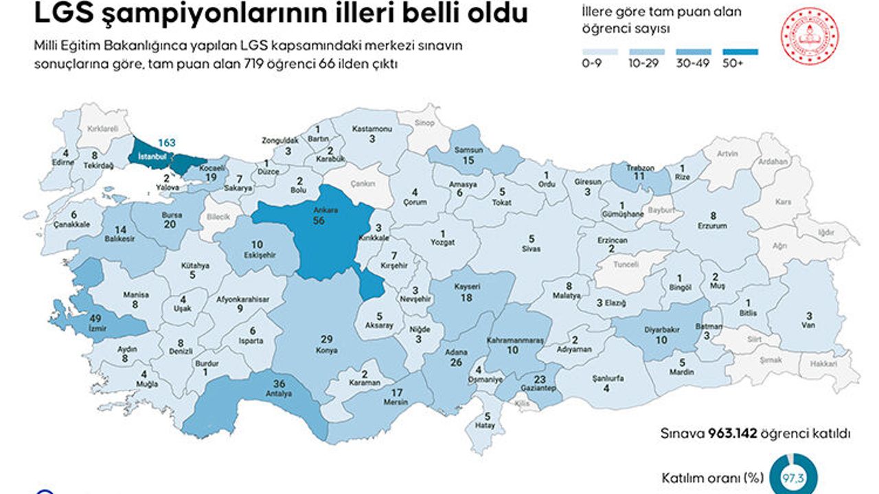 Bu kapsamda İstanbul'dan 163, Ankara'dan 56, İzmir'den ise 49 öğrenci sınavda 500 tam puan aldı.