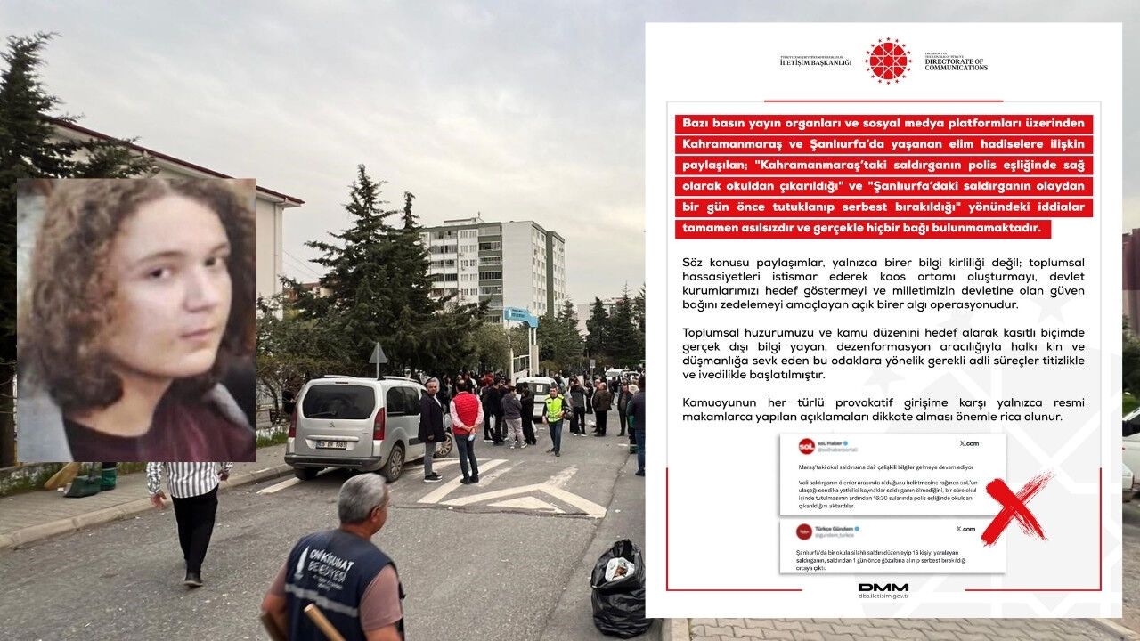 Dezenformasyonla Mücadele Merkezi, halkın hassasiyetlerini hedef alan paylaşımlara karşı vatandaşları uyardı. Yapılan resmi duyuruda, "Kahramanmaraş’taki saldırganın polis eşliğinde sağ olarak okuldan çıkarıldığı" yönündeki iddiaların tamamen kurgu olduğu vurgulandı. DMM, bu tür paylaşımların devlet kurumlarını hedef göstermek ve halkın güvenini sarsmak amacıyla yapıldığını belirtti. Olay yerinden elde edilen resmi raporlara göre, saldırganın etkisiz hale getirilme süreciyle ilgili dezenformasyon yapan odaklara karşı adli sürecin başlatıldığı bildirildi.