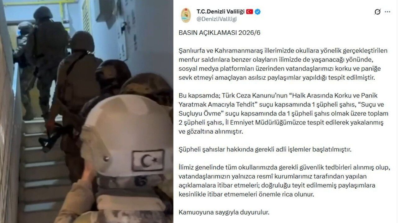 Denizli Valiliği, operasyonun ardından yaptığı açıklamada kentteki güvenlik önlemlerinin eksiksiz alındığını vurguladı. Açıklamada, "İlimiz genelinde tüm okullarımızda gerekli güvenlik tedbirleri alınmış olup, vatandaşlarımızın yalnızca resmi kurumlarımız tarafından yapılan açıklamalara itibar etmeleri önemle rica olunur" denildi. Valilik, doğruluğu teyit edilmemiş paylaşımların toplumsal huzuru bozmayı hedeflediğini belirterek dijital dezenformasyona karşı sert bir duruş sergiledi.