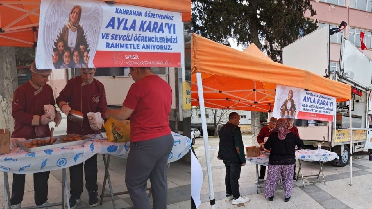Kahramanmaraş Onikişubat’taki okul saldırısında hayatını kaybeden Ayla Kara öğretmenin, öğrencileri için kendisini siper ettiği bilgisinin ardından eğitim camiasında kahraman ilan edilmesi, Sarıgöl’deki etkinlikte de geniş yer buldu. Öğrenciler, "Ayla öğretmenimiz ve kardeşlerimiz kalbimizde" diyerek acıyı paylaştı. Dağıtılan lokmaların ardından Sarıgöl İlçe Müftülüğü görevlileri tarafından tüm eğitim şehitleri için toplu dua yapıldı.