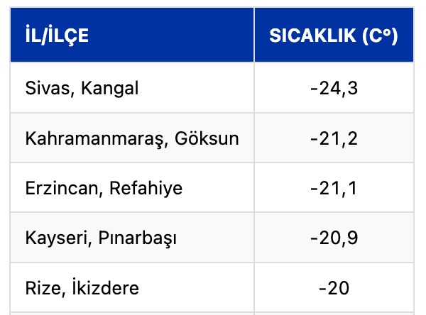 TÜRKİYE’DE EN SOĞUK 5 NOKTA (19-20 OCAK 2026 GECESİ):