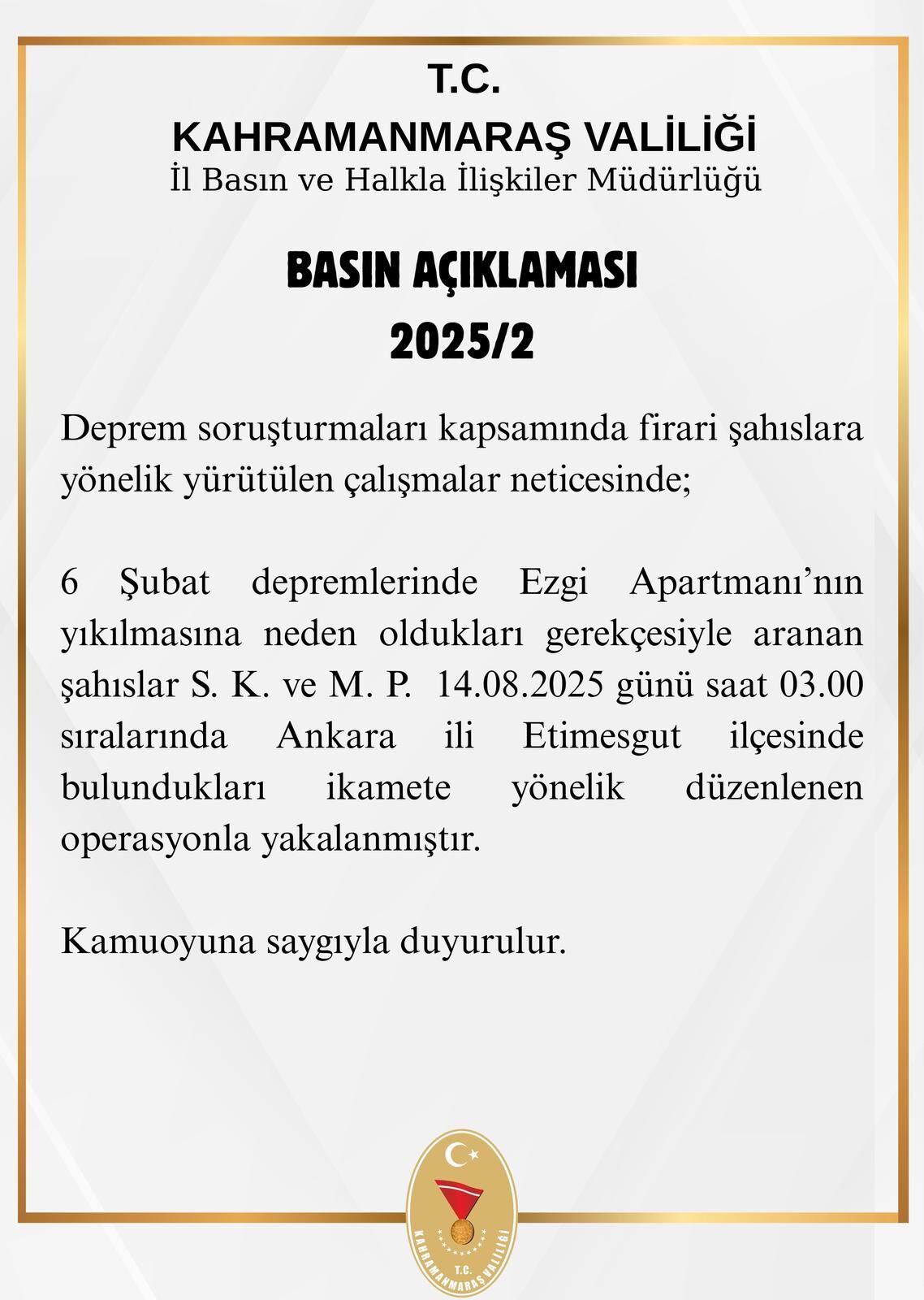 Kahramanmaraş merkezli depremlerde ağır yıkıma neden olan Ezgi Apartmanı’nın çökmesiyle ilgili başlatılan adli süreçte önemli bir aşama kaydedildi. Olayda ihmalleri olduğu iddiasıyla haklarında yakalama kararı çıkarılan Kervancıoğlu ve Pekel’in izini süren ekipler, şüphelilerin Ankara’da olduklarını tespit etti.