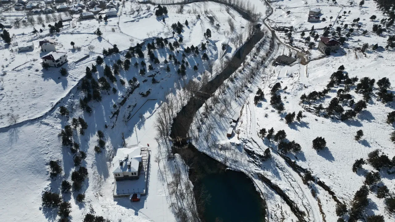Karla kaplı ağaçlar arasında parlayan Yeşilgöz Gölü’nün eşsiz manzarası, drone ile havadan görüntülendi. Buz gibi hava, gölün doğal güzelliğini örtmedi; aksine daha da öne çıkardı. Havanın açık olması sayesinde gölün rengi ve çevresi net şekilde kaydedildi.