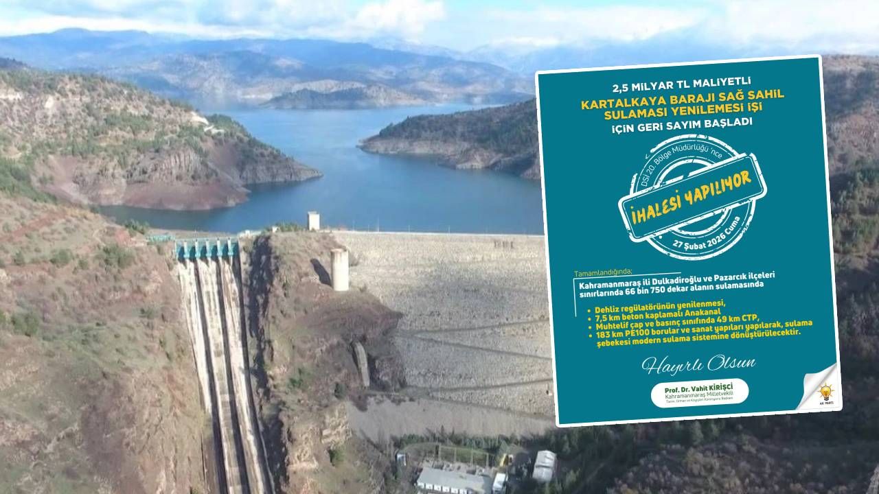 AK Parti Kahramanmaraş Milletvekili Prof. Dr. Vahit Kirişci, 66 bin 750 dekar tarım arazisini modern sulama altyapısına kavuşturacak Kartalkaya Barajı Sağ Sahil Sulaması Yenileme Projesi’nde kritik sürece girildiğini açıkladı. Projenin ihalesi 27 Şubat 2026’da yapılacak.