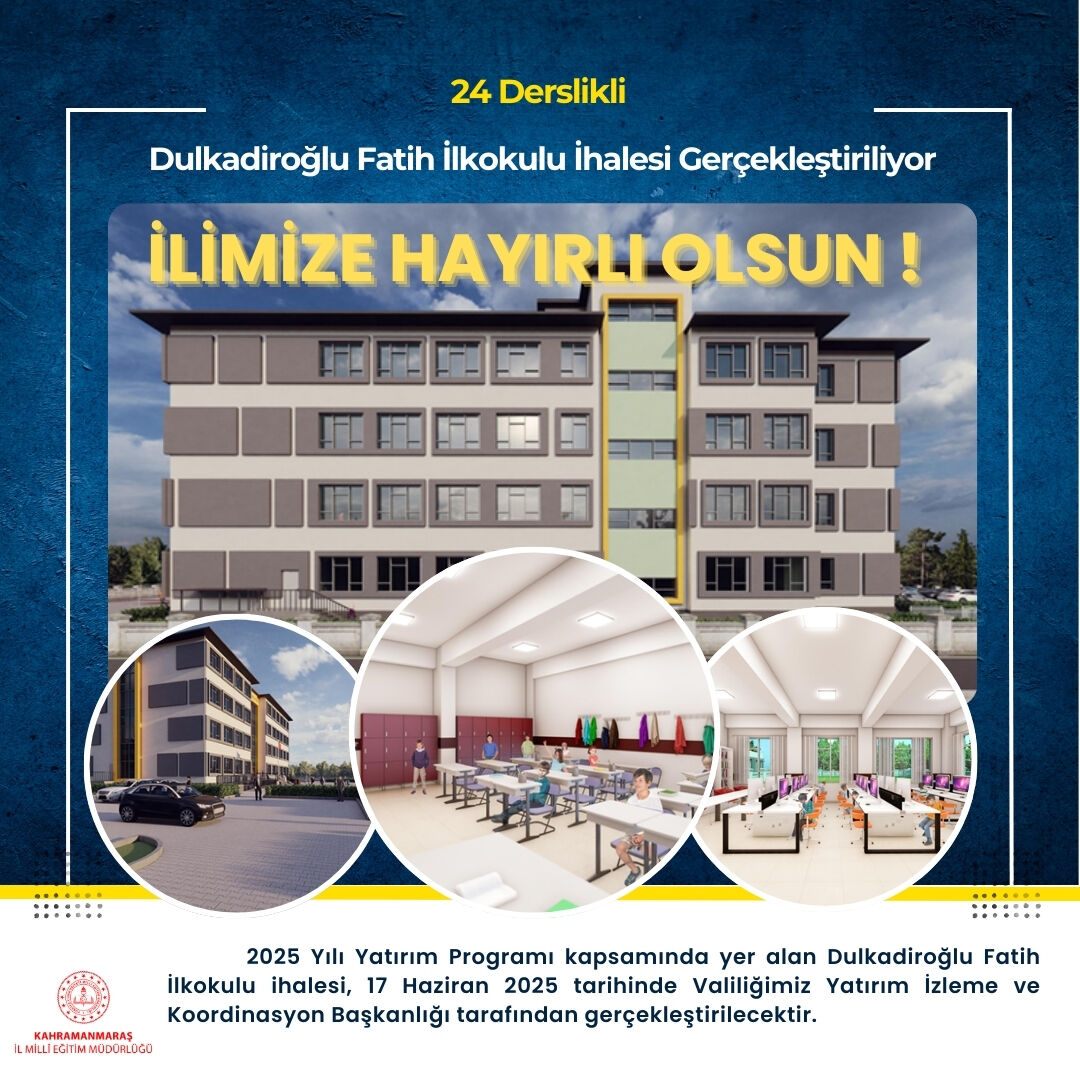 Kahramanmaraş'ın eğitim yatırımları hız kesmeden sürüyor. 2025 yılı yatırım programı çerçevesinde planlanan 24 derslikli Dulkadiroğlu Fatih İlkokulu’nun yapım ihalesi, 17 Haziran 2025 tarihinde Kahramanmaraş Valiliği Yatırım İzleme ve Koordinasyon Başkanlığı (YİKOB) tarafından yapılacak.