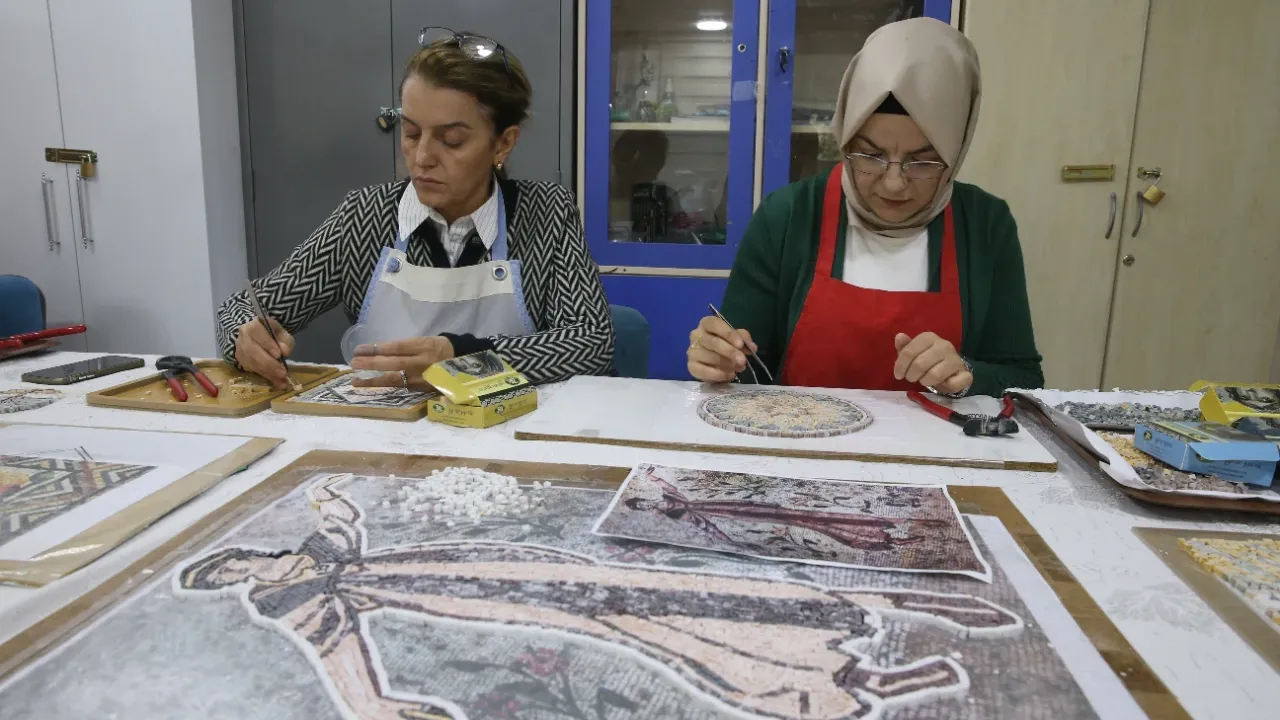 2007’de kaçak kazı sonrası ortaya çıkan bu tarihi mozaikler, halk eğitimi merkezindeki kursiyerler tarafından modern sanat eserlerine dönüştürülüyor. Mozaik figürleri önce fotoğraflanıyor, ardından büyük boyutlu kağıtlara renkli olarak aktarılıyor. Kursiyerler, daha sonra taşları küçük parçalara ayırıp tek tek dizerek tarihi figürleri yeniden yorumluyor.