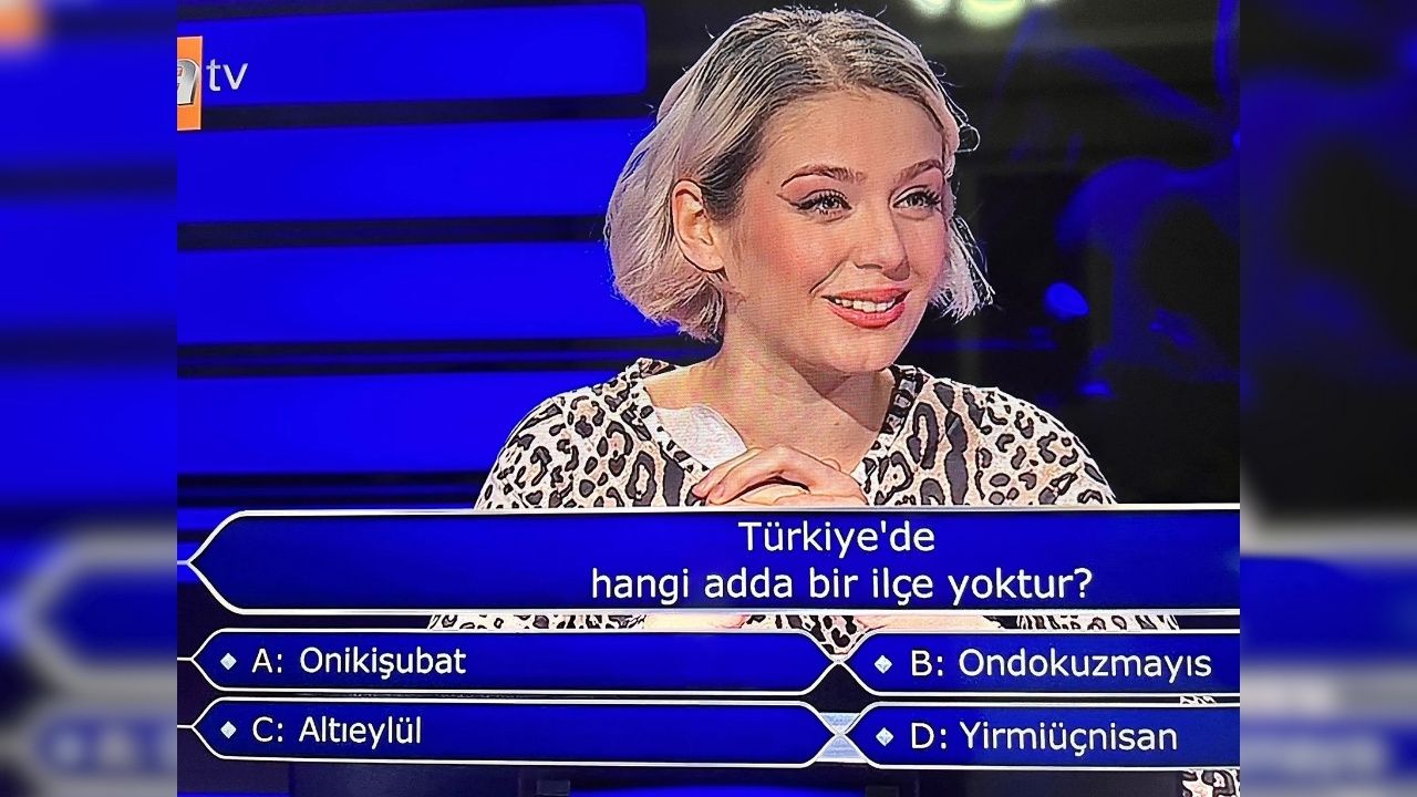 ATV ekranlarında yayınlanan “Kim Milyoner Olmak İster” yarışmasının 18 Ocak 2026 tarihli bölümünde Kahramanmaraş bağlantılı bir soru dikkat çekti. Yarışmanın 200 bin TL değerindeki sorusu, Türkiye’deki ilçe adlarıyla ilgiliydi. Şıklar arasında Kahramanmaraş’ın merkez ilçesi Onikişubat da yer aldı.