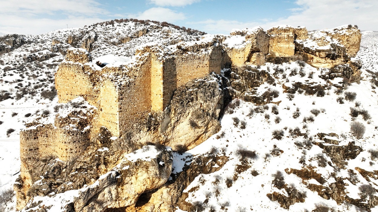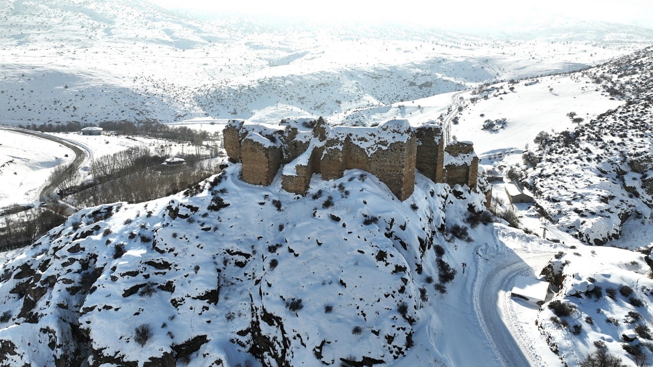 Kahramanmaraş’ın tarihi ve doğal güzellikleri, kış aylarında bambaşka bir çehreye bürünüyor. Bu eşsiz manzaralardan biri de Afşin ilçesine bağlı Marabuz Dağlıca Mahallesi’nde yer alan Hurman Kalesi… Geçtiğimiz günlerde etkili olan kar yağışının ardından beyaz örtüyle kaplanan kale, adeta zamana meydan okuyan görüntüsüyle görenleri büyüledi.