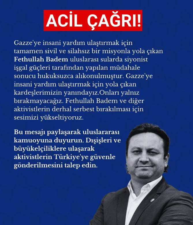 Badem’in video mesajında, “Bu videoyu izliyorsanız İsrail tarafından kaçırıldım ve iradem dışında İsrail’e götürüldüm. Hükümetimden beni eve getirmesini isteyin. Gazze’deki insani krizi durdurun” ifadelerine yer verildi. Aktivistin yakın çevresi ve sivil toplum kuruluşları, Badem’in derhal serbest bırakılması çağrısında bulundu.