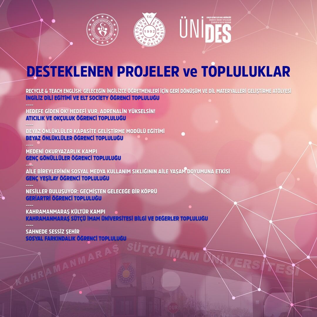 Kahramanmaraş Sütçü İmam Üniversitesi (KSÜ), öğrenci topluluklarının hazırladığı projelerle, Gençlik ve Spor Bakanlığı Gençlik Hizmetleri Genel Müdürlüğü’nün 2024-2025 yılı 4. Dönem Üniversite Öğrenci Toplulukları İş Birliği ve Destek Programı (ÜNİDES) kapsamında önemli bir başarıya imza attı.