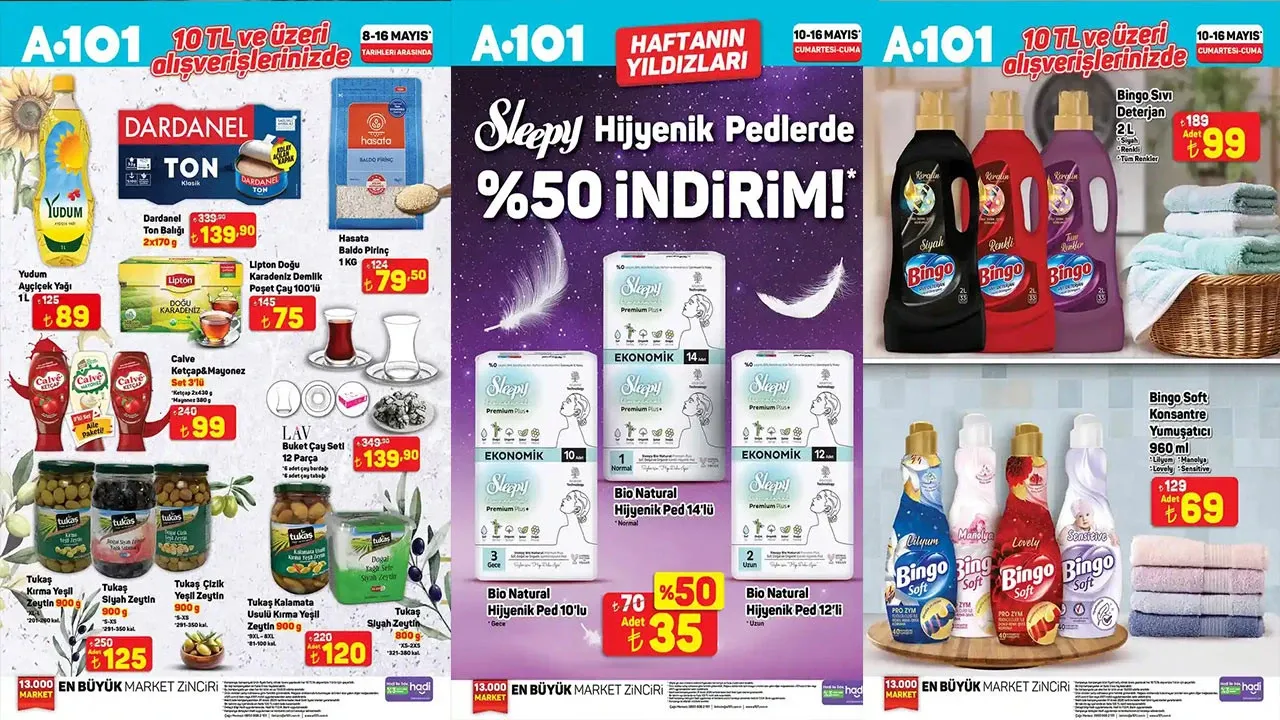 Kahramanmaraşlı tüketicilerin yakından takip ettiği A101 marketler zinciri, 10-16 Mayıs tarihleri arasında geçerli olacak "Haftanın Yıldızları" kampanyasını başlattı. Her perşembe olduğu gibi bu hafta sonu da birbirinden cazip indirimlerle dolu raflar, Kahramanmaraşlı müşterilerini bekliyor. Özellikle sıvı deterjan çeşitlerindeki indirimler dikkat çekiyor.