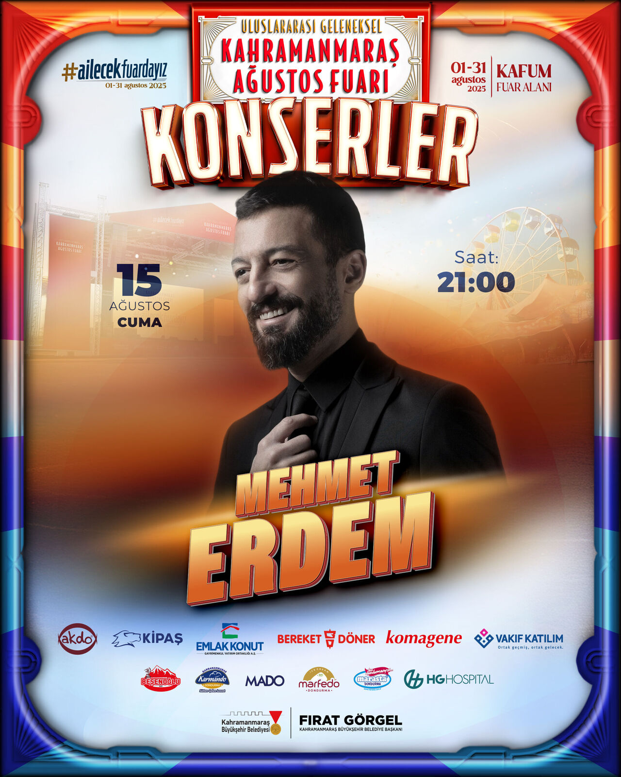 Kahramanmaraş Büyükşehir Belediyesi tarafından düzenlenen Uluslararası Geleneksel Ağustos Fuarı, 15 Ağustos Cuma akşamı müzikseverleri Mehmet Erdem ile buluşturacak. KAFUM Fuar Alanı’nda saat 21.00’de başlayacak konser, pop müzik tutkunları için unutulmaz bir deneyim sunacak.