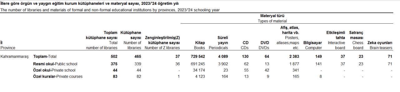 2023–2024 öğretim yılında Kahramanmaraş’ta 502 eğitim kurumu kütüphanesi hizmet verdi. Bunlardan 465’i standart, 37’si zenginleştirilmiş kütüphane olarak hizmet sundu.