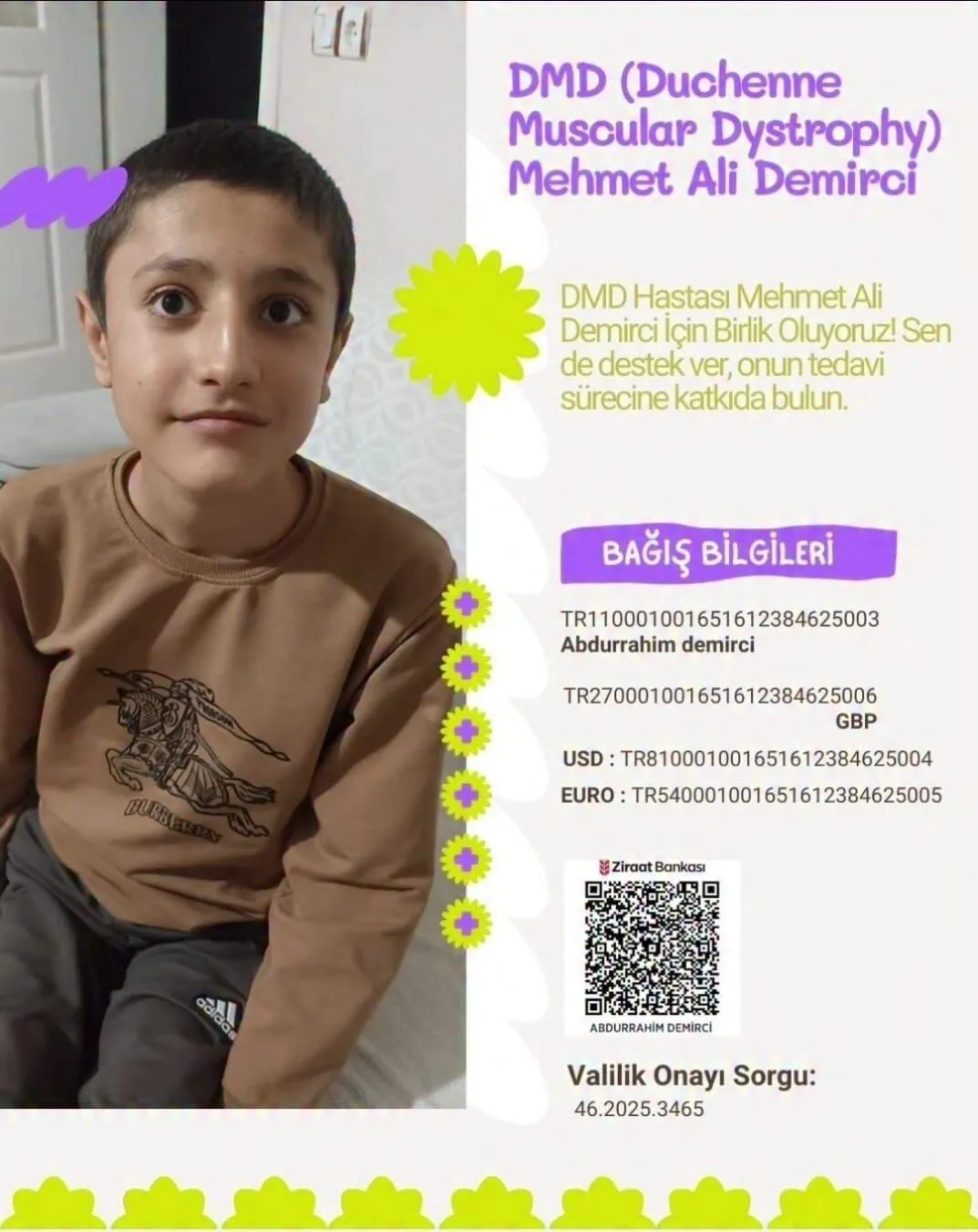 Kahramanmaraş’ın Ekinözü ilçesinde yaşayan 14 yaşındaki Mehmet Ali Demirci, nadir görülen ve ölümcül seyreden Duchenne Musküler Distrofi (DMD) hastalığıyla yaşam mücadelesi veriyor. Henüz çocuk yaşta ağır bir hastalıkla karşı karşıya kalan Mehmet Ali için, Kahramanmaraş Valiliği onaylı bir yardım kampanyası başlatıldı. Aile, zamanla yarışılan bu süreçte hayırseverlerin desteğini bekliyor.