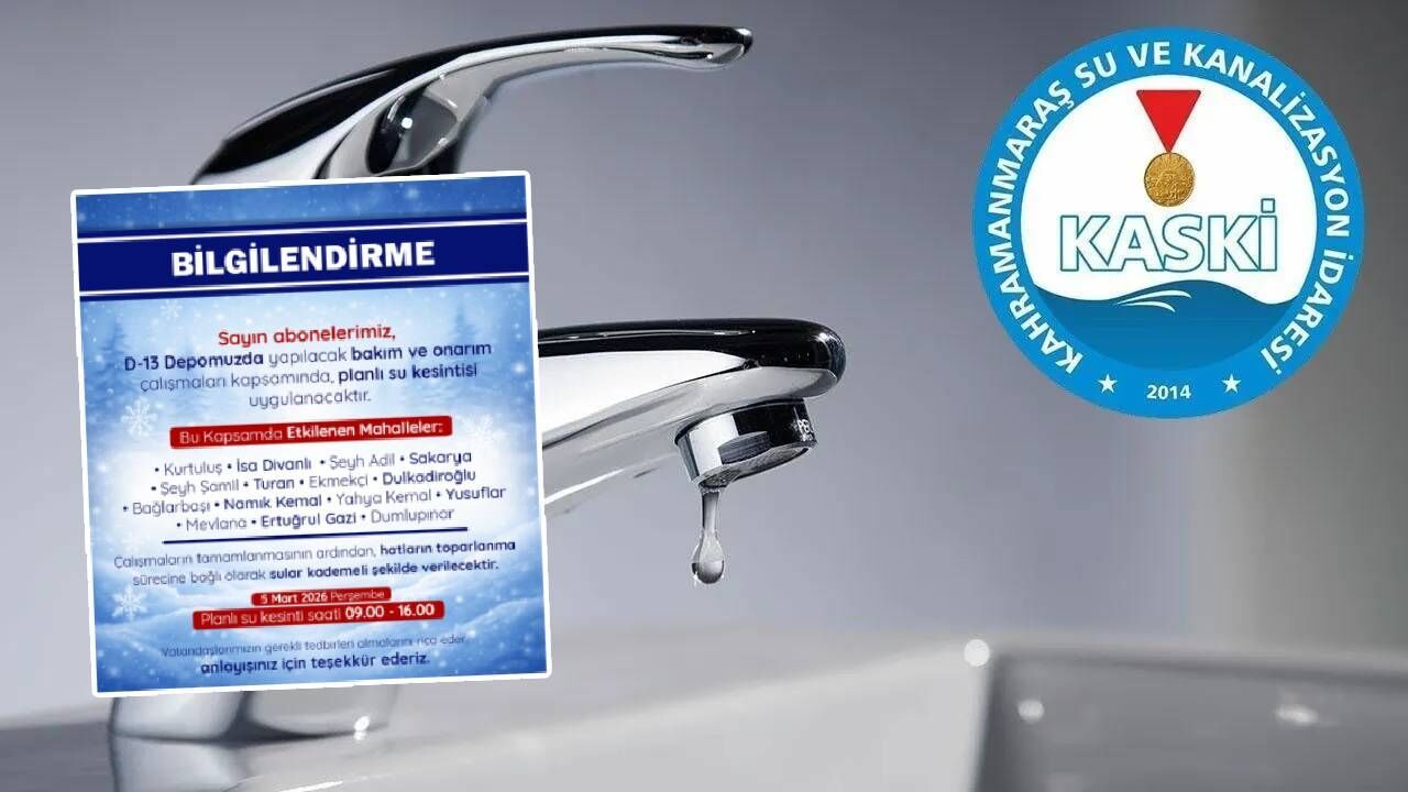 Kahramanmaraş Büyükşehir Belediyesi Su ve Kanalizasyon İdaresi Genel Müdürlüğü (KASKİ), D-13 Deposu’nda gerçekleştirilecek bakım ve onarım çalışmaları nedeniyle bazı mahallelerde planlı su kesintisi uygulanacağını duyurdu.