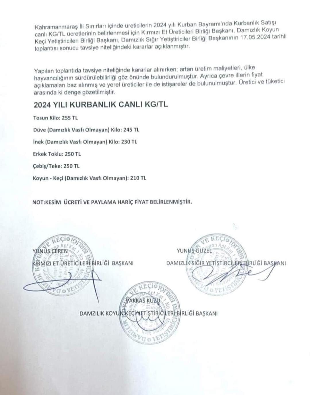 Bu kararlar ile Kahramanmaraş ilindeki kurban bayramı satışlarının düzenlenmesi ve fiyatların belirlenmesi konusunda bir adım atılmış oldu. Üreticiler ve tüketiciler, belirlenen fiyatlar doğrultusunda hazırlıklarını yapabilecekler.