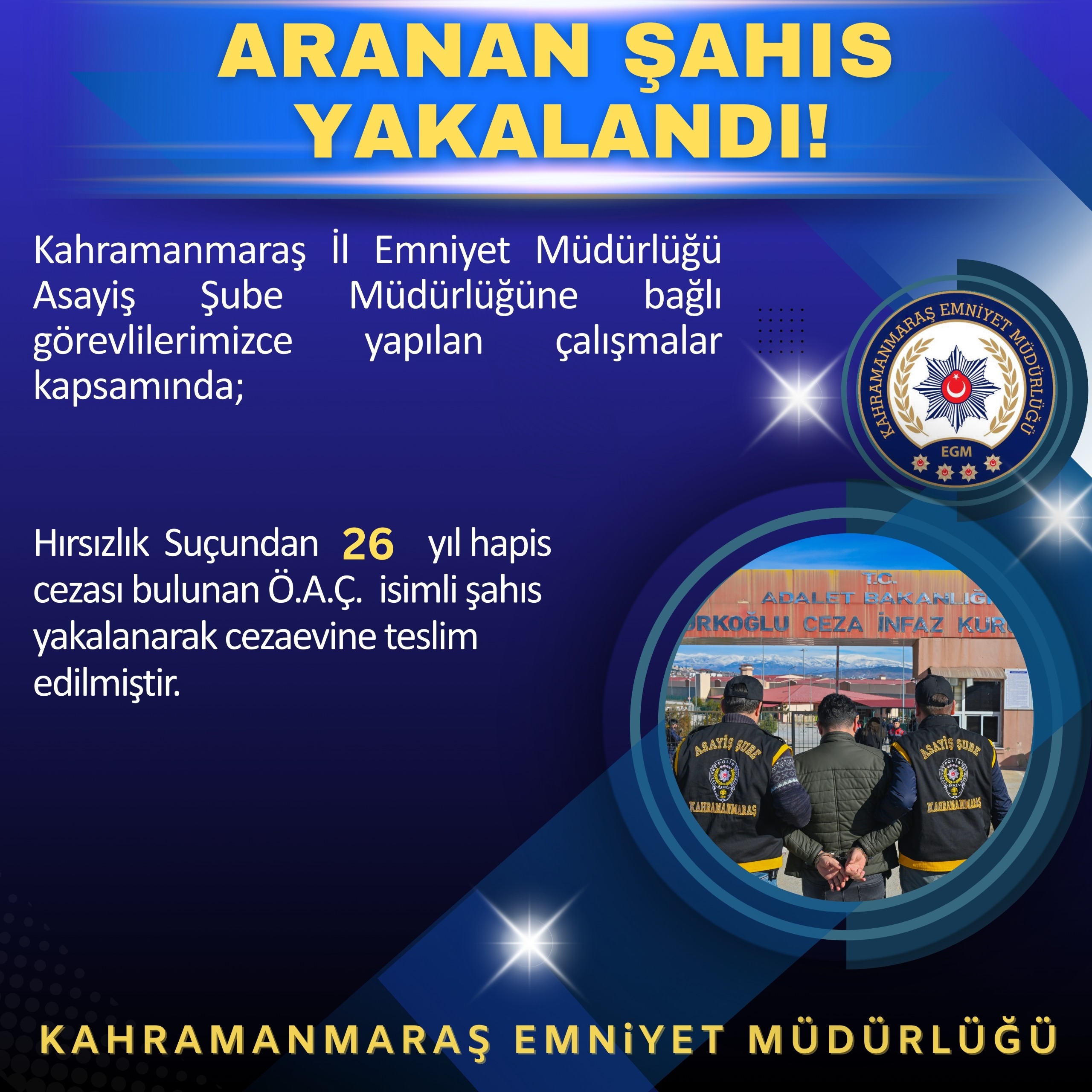 Kahramanmaraş’ta güvenlik güçleri tarafından yürütülen planlı çalışmalar neticesinde, uzun süredir firari olan bir hükümlü daha yakalandı. Hırsızlık suçundan 26 yıl kesinleşmiş hapis cezası bulunan Ö.A.Ç. isimli şahıs, Kahramanmaraş İl Emniyet Müdürlüğü Asayiş Şube Müdürlüğü ekiplerince yakalanarak cezaevine teslim edildi.