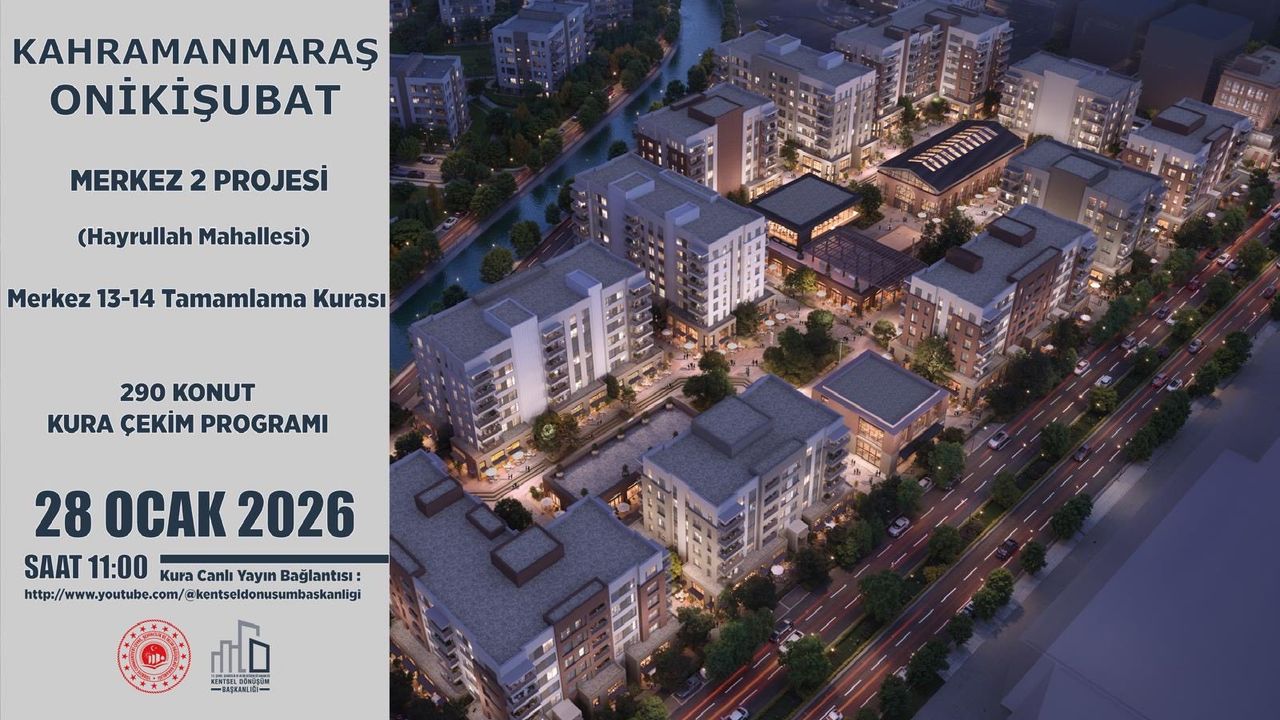Kahramanmaraş’ta Merkez 2 Projesi (Hayrullah Mahallesi) kapsamında yürütülen Merkez 13-14 Tamamlama Kurası, 28 Ocak 2026 Çarşamba günü noter huzurunda gerçekleştirilecek. Kura çekimi ile 290 konutun hak sahipleri belirlenecek.