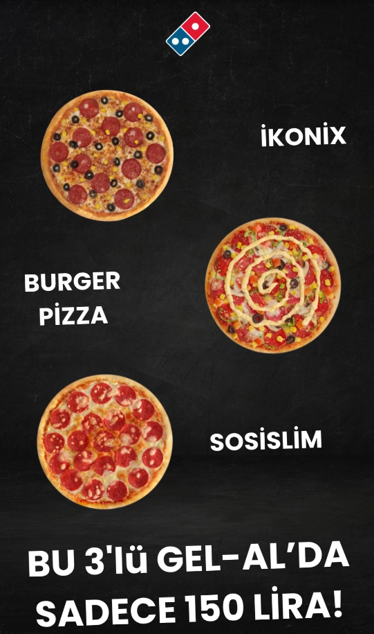 Domino's yeni çıkan İkonix, Burger Pizza ve Sosislim pizzalarında efsane bir kampanya başlattı. GEL-AL ve restoranda geçerli bu fırsatta ortaboy pizzalar sadece 150 lira oldu.