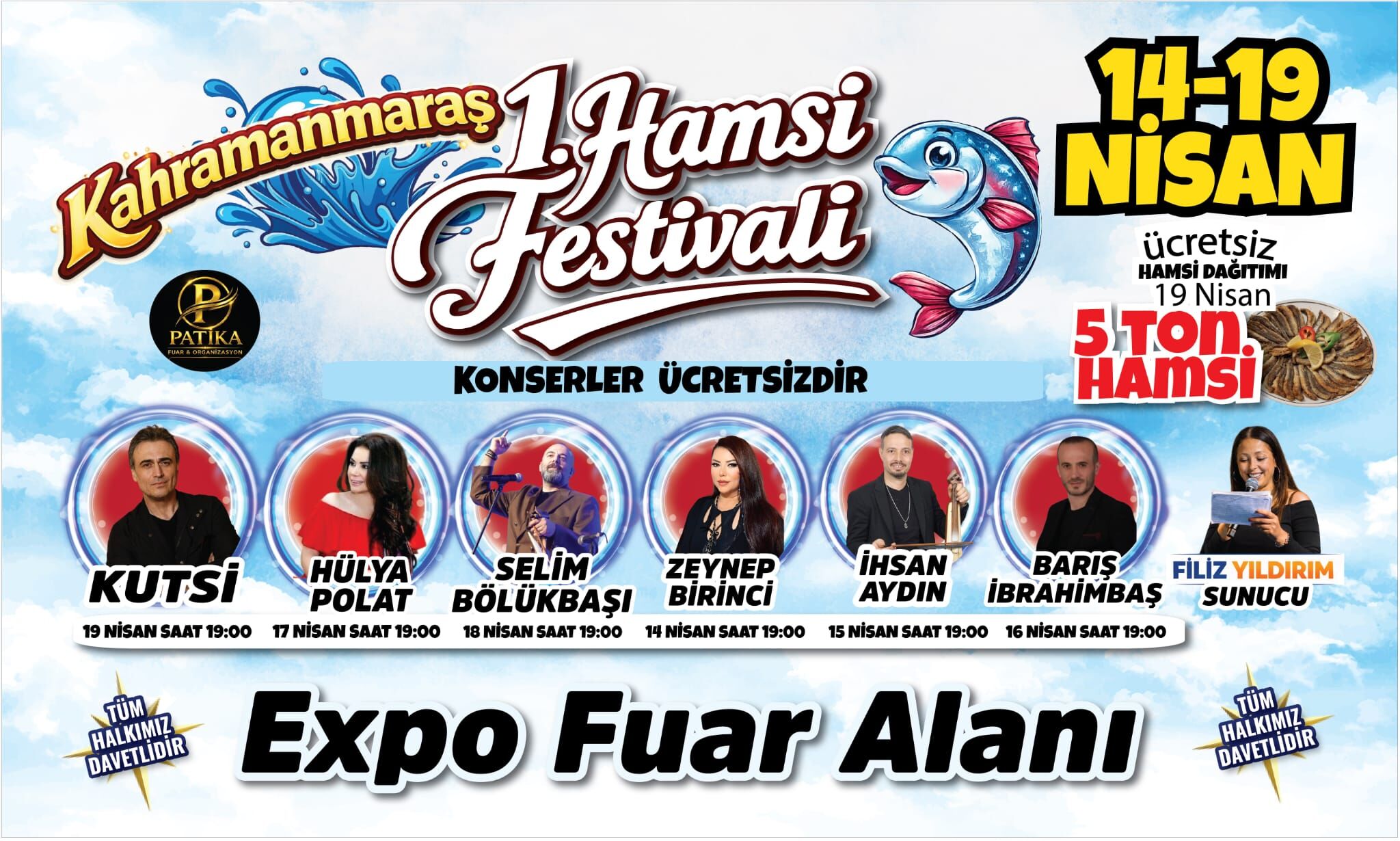 Organizasyonun en dikkat çeken unsuru olan hamsi şöleni, 19 Nisan günü zirve yapacak. Toplamda 5 ton taze hamsi, özel kurulan dev ızgaralarda pişirilerek festival alanındaki tüm misafirlere ücretsiz olarak ikram edilecek. Karadeniz’in bu meşhur lezzetini Kahramanmaraş’a taşıyan Patika Fuar ve Organizasyon yetkilileri, amaçlarının hem kültürel bir etkileşim sağlamak hem de vatandaşlara keyifli bir hafta geçirtmek olduğunu belirtti. "Tüm halkımız davetlidir" sloganıyla duyurulan etkinliğe, çevre illerden de yoğun katılım bekleniyor.