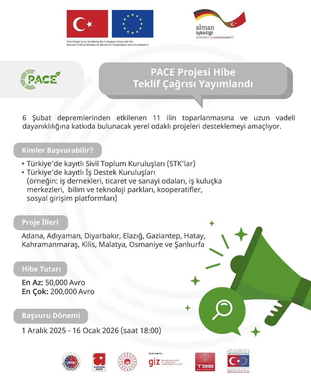 PACE Projesi, 6 Şubat 2023’te meydana gelen büyük depremlerden etkilenen 11 ilin (Adana, Adıyaman, Diyarbakır, Elazığ, Gaziantep, Hatay, Kahramanmaraş, Kilis, Malatya, Osmaniye ve Şanlıurfa) toparlanmasına katkı sağlamak amacıyla yerel odaklı projeleri desteklemeyi hedefliyor. Bu doğrultuda, yerel kamu hizmetlerinin kapsayıcı ve sürdürülebilir şekilde sunulmasını sağlamak için hibe teklif çağrısı yayımlandı.