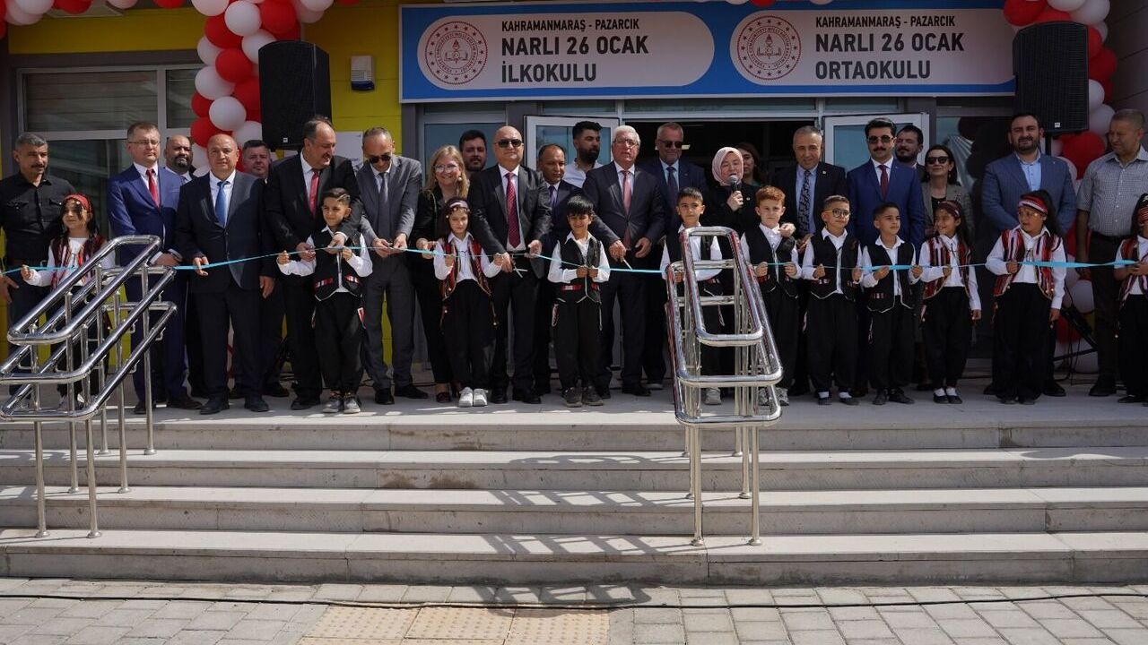 Kahramanmaraş’ın Pazarcık ilçesine bağlı Narlı Mahallesi’nde düzenlenen törenle, yapımı tamamlanan 26 Ocak İlkokulu ve Ortaokulu hizmete girdi. Törene Kahramanmaraş milletvekilleri Dr. Tuba Köksal ve Dr. İrfan Karatutlu, Pazarcık Kaymakamı Muhammed Kaya ile Avrupa Birliği ve KfW Kalkınma Bankası temsilcileri de katıldı.