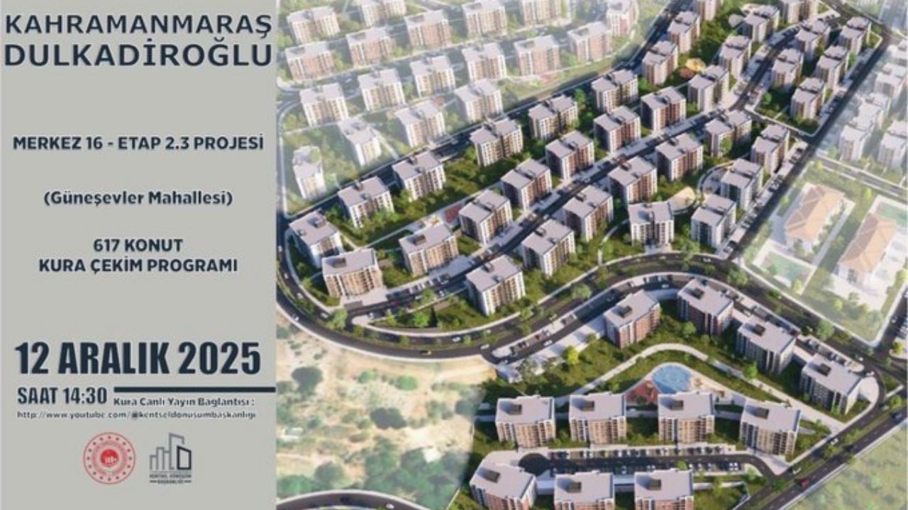 Kahramanmaraş’ta Merkez 16 – Etap 2.3 kapsamında inşa edilen 617 konut için kura çekimi heyecanı yaşanacak. Güneşevler Mahallesi’nde yer alan projede hak sahipleri, 12 Aralık 2025 Cuma günü saat 14.30’da noter huzurunda yapılacak kura töreniyle belirlenecek.