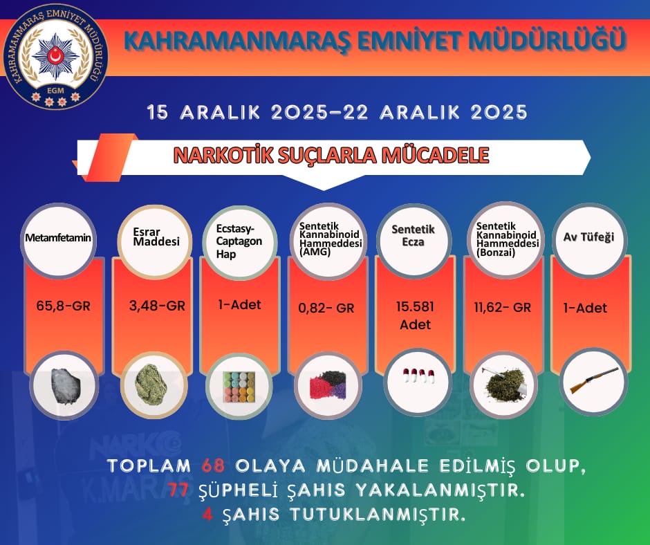 Kahramanmaraş Emniyet Müdürlüğü Narkotik Suçlarla Mücadele Şube Müdürlüğü ekipleri, 15–22 Aralık 2025 tarihleri arasında il genelinde yürütülen narkotik operasyonlarının sonuçlarını kamuoyuyla paylaştı. Emniyet birimleri bu süreçte 68 ayrı olaya müdahale etti.