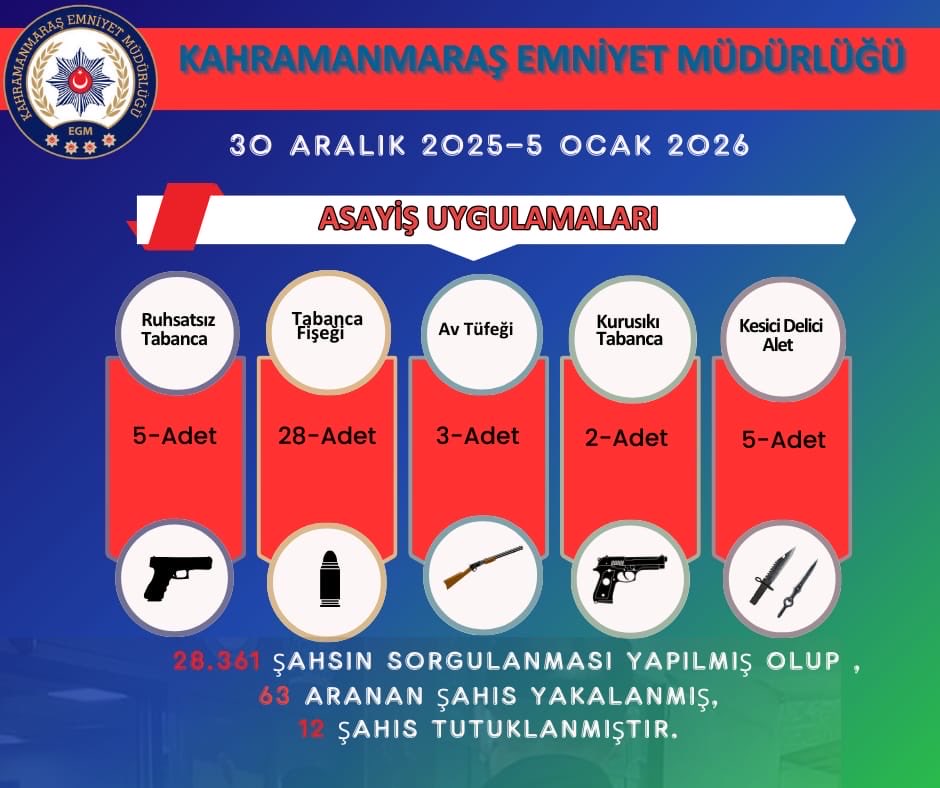 Kahramanmaraş Emniyet Müdürlüğü, yıl sonu ve yeni yılın ilk günlerini kapsayan dönemde asayiş uygulamalarına hız verdi. 30 Aralık 2025 ile 5 Ocak 2026 tarihleri arasında kent genelinde gerçekleştirilen denetimlerde 28.361 kişinin sorgulaması yapıldı. Yapılan çalışmalar sonucunda 63 aranan şahıs yakalanırken, 12 kişi tutuklandı.
