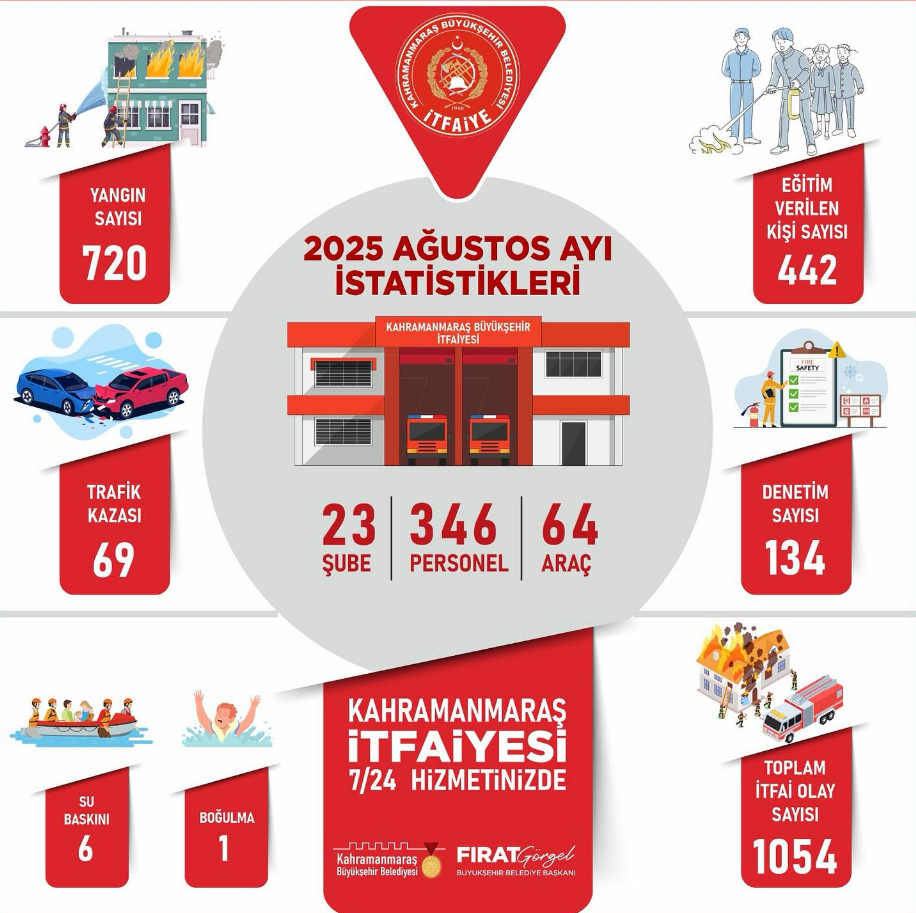 Kahramanmaraş Büyükşehir Belediyesi İtfaiyesi, 2025 yılı Ağustos ayı faaliyet raporunu açıkladı. Resmî verilere göre ekipler, bir ay içinde kent genelinde toplam bin 54 farklı olaya müdahale ederek yoğun bir çalışma dönemi geçirdi.