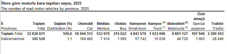 Türkiye genelinde 2025 yılı itibarıyla motorlu kara taşıtları sayısı 32 milyon 828 bine ulaştı. Kahramanmaraş’ta ise toplam araç sayısı 345 bini aştı.